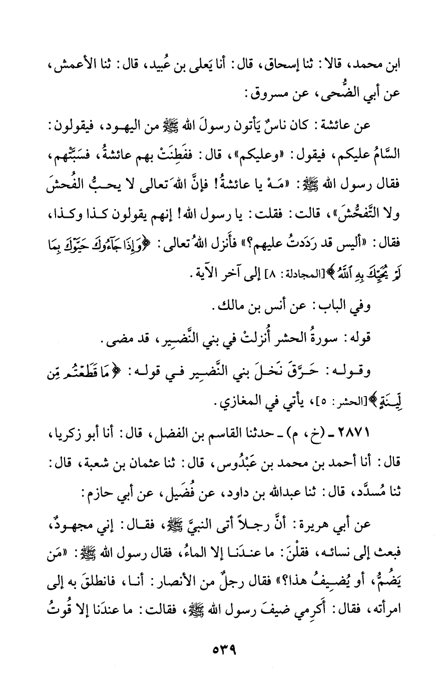 2871 - (خ، م) - حدثنا القاسم بن الفضل، قال: أنا أبو زكريا، قال: أنا أحمد بن محمد بن عبدوس، قال: ثنا عثمان بن شعبة، قال: ثنا مسدد، قال: ثنا عبد الله بن داود، عن فضيل، عن أبي حازم: