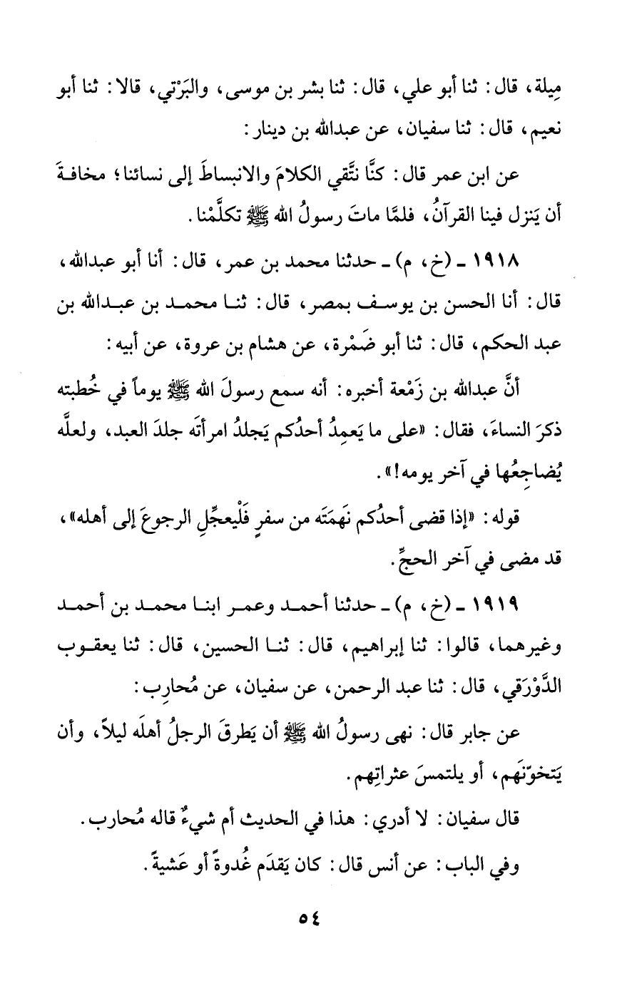 1919 - (خ، م) - حدثنا أحمد وعمر ابنا محمد بن أحمد وغيرهما، قالوا: ثنا إبراهيم، قال: ثنا الحسين، قال: ثنا يعقوب الدورقي، قال: ثنا عبد الرحمن، عن سفيان، عن محارب:
