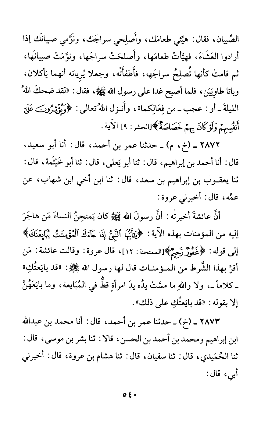 2873 - (خ) - حدثنا عمر بن أحمد، قال: أنا محمد بن عبد الله بن إبراهيم ومحمد بن أحمد بن الحسن، قالا: ثنا بشر بن موسى، قال: ثنا الحميدي، قال: ثنا سفيان، قال: ثنا هشام بن عروة، قال: أخبرني أبي، قال:
