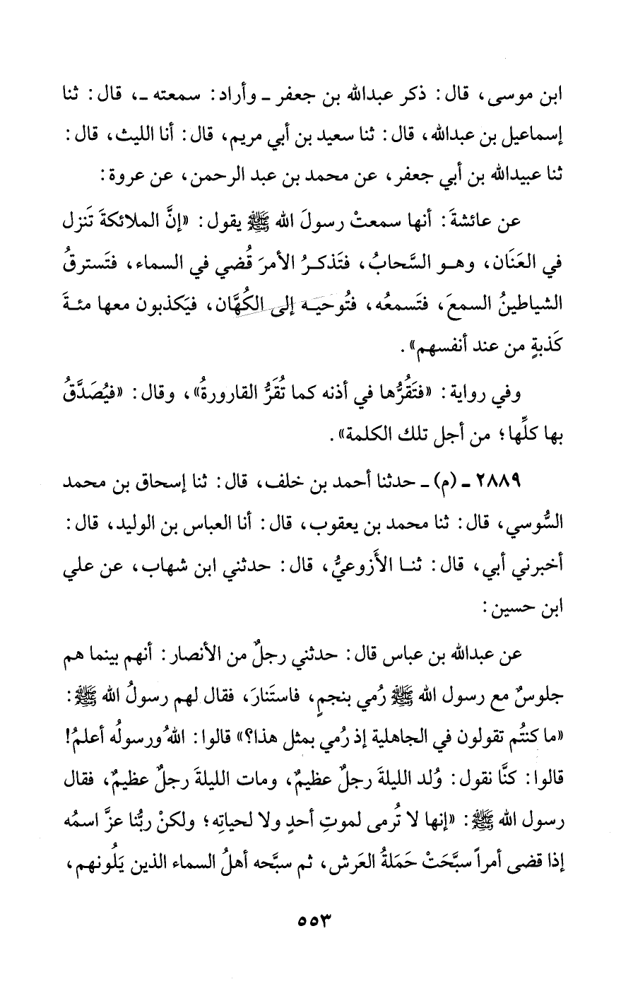 عن عبد الله بن عباس قال: حدثني رجل من الأنصار: أنهم بينما هم جلوس مع رسول الله صلى الله عليه وسلم رمي بنجم، فاستنار، فقال لهم رسول الله صلى الله عليه وسلم: ((ما كنتم تقولون في الجاهلية إذ رمي بمثل هذا؟)) قالوا: الله ورسوله أعلم! قالوا: كنا نقول: ولد الليلة رجل عظيم، ومات الليلة رجل عظيم، فقال رسول الله صلى الله عليه وسلم: ((إنها لا ترمى لموت أحد ولا لحياته؛ ولكن ربنا عز اسمه إذا قضى أمرا سبحت حملة العرش، ثم سبحه أهل السماء الذين يلونهم، #554# ثم الذين يلونهم، حتى يبلغ التسبيح أهل هذه السماء الدنيا، ثم يقول الذين يلون حملة العرش: ماذا قال ربكم؟ فيخبرونهم ماذا قال، فيستخبر أهل السموات بعضها بعضا، حتى يبلغ الخبر أهل هذه السماء الدنيا، فيخطف الجن السمع، فيلقونه إلى أوليائهم ويرمون، فما جاؤوا به على وجهه فهو الحق، ولكنهم يقرفون فيه ويزيدون)).