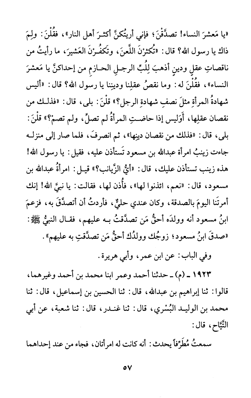 سمعت مطرفا يحدث: أنه كانت له امرأتان، فجاء من عند إحداهما #58# إلى الأخرى، قال: فجعلت تنزع عمامته، وتقول له: جئت من عند امرأتك؟ فقال: جئت من عند عمران بن حصين، فحدث عن النبي صلى الله عليه وسلم أنه قال: ((أقل سكان الجنة النساء)).