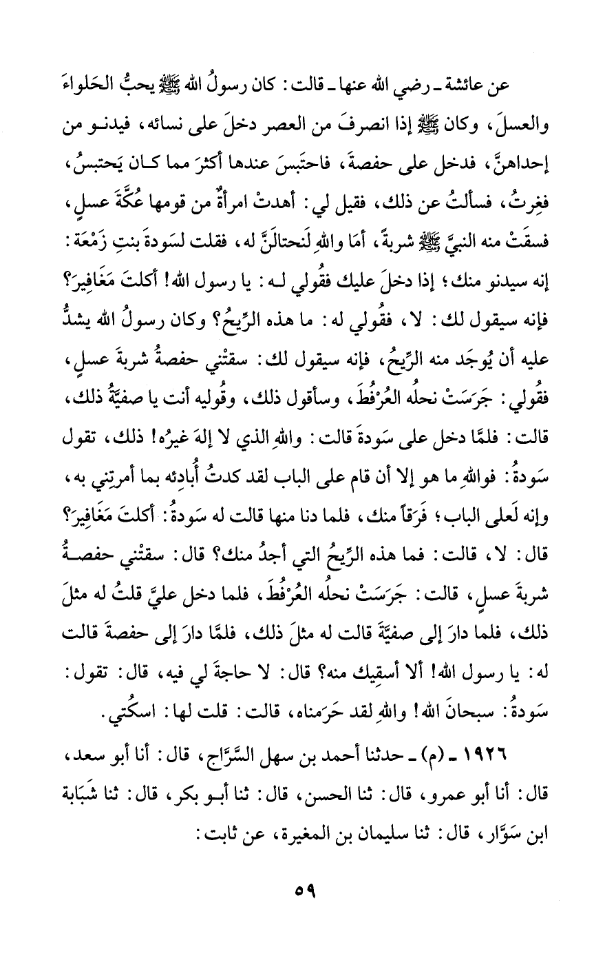 عن أنس قال: كان النبي صلى الله عليه وسلم له تسع نسوة، فكان إذا قسم بينهن لا ينتهي إلى المرأة إلا في تسع، فكن يجتمعن كل ليلة في بيت التي يأتيها، فكان في بيت عائشة، فجاءت زينب، فمد يده إليها، فقالت: هذه زينب، فكف النبي صلى الله عليه وسلم يده، فتقاولتا حتى استحيتا، وأقيمت الصلاة، فمر أبو بكر على ذلك، فسمع أصواتهما، فقال: اخرج يا رسول الله إلى الصلاة، واحث في أفواهن التراب، فخرج النبي صلى الله عليه وسلم، فقالت عائشة: الآن يقضي النبي صلى الله عليه وسلم صلاته، فيجيء أبو بكر، فيفعل بي ويفعل، فلما قضى النبي صلى الله عليه وسلم صلاته أتاها أبو بكر، فقال لها قولا شديدا، وقال: أتصنعين هذا برسول الله صلى الله عليه وسلم؟!