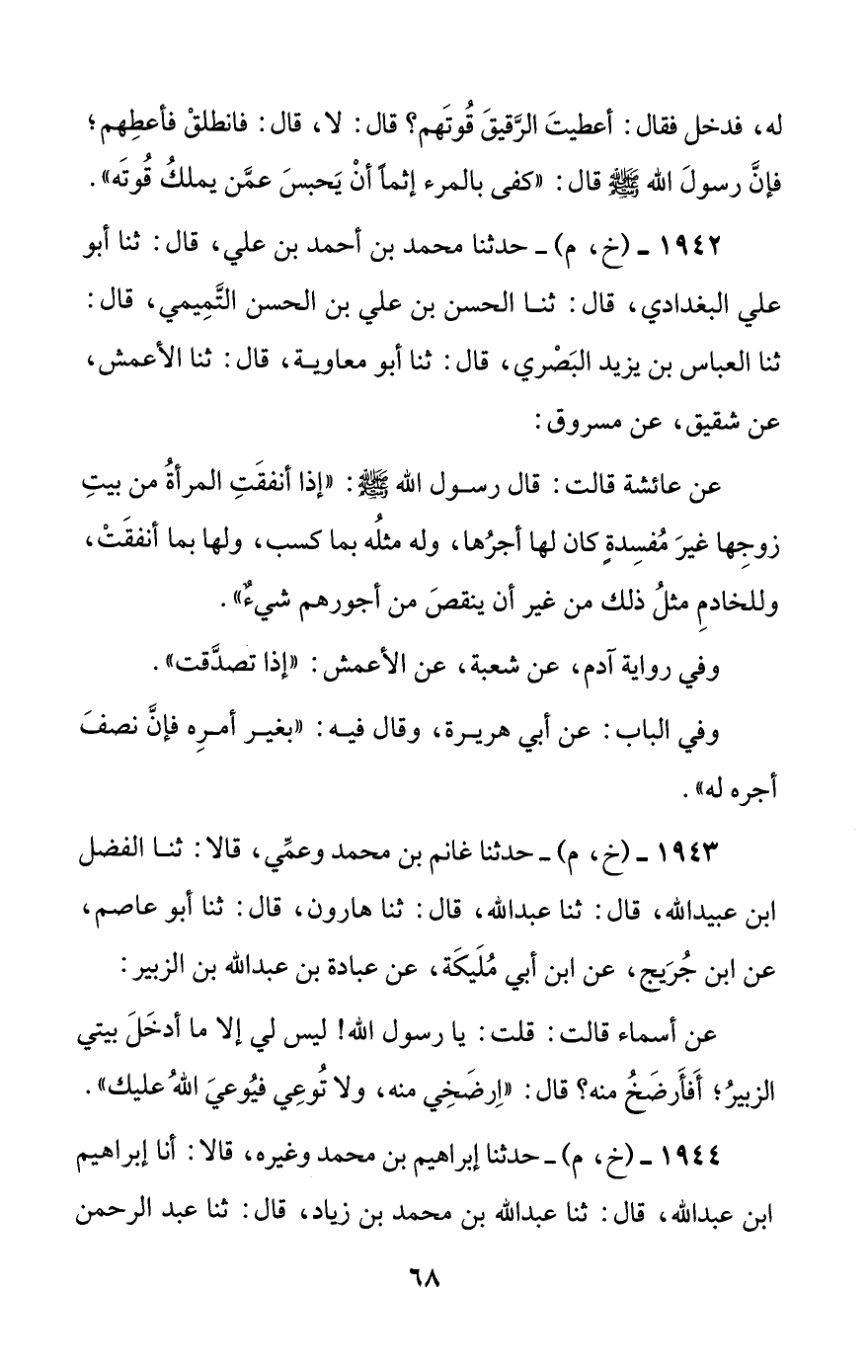 1942 - (خ، م) - حدثنا محمد بن أحمد بن علي، قال: ثنا أبو علي البغدادي، قال: ثنا الحسن بن علي بن الحسن التميمي، قال: ثنا العباس بن يزيد البصري، قال: ثنا أبو معاوية، قال: ثنا الأعمش، عن شقيق، عن مسروق: