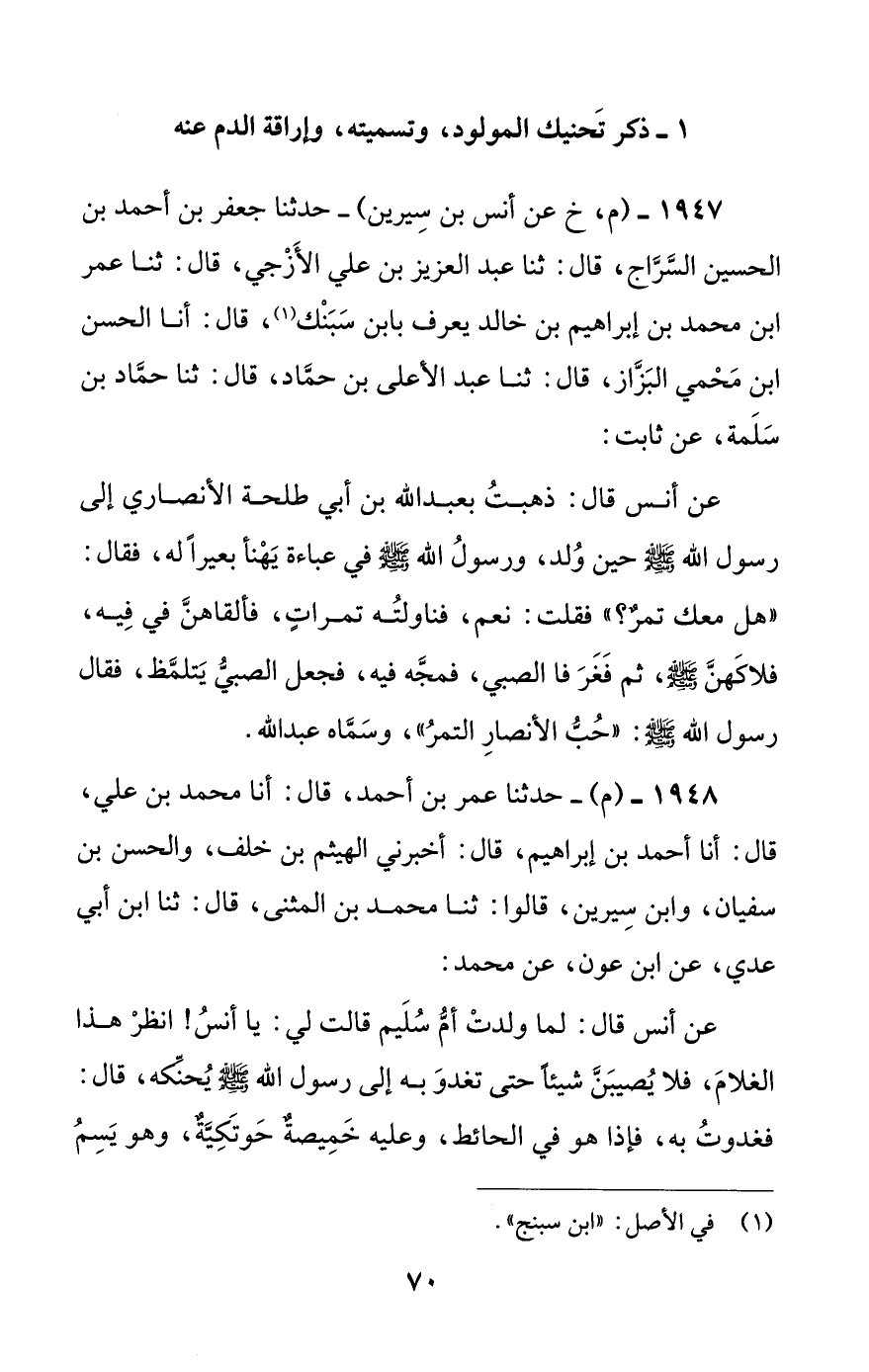 [1] ذكر تحنيك المولود، وتسميته، وإراقة الدم عنه