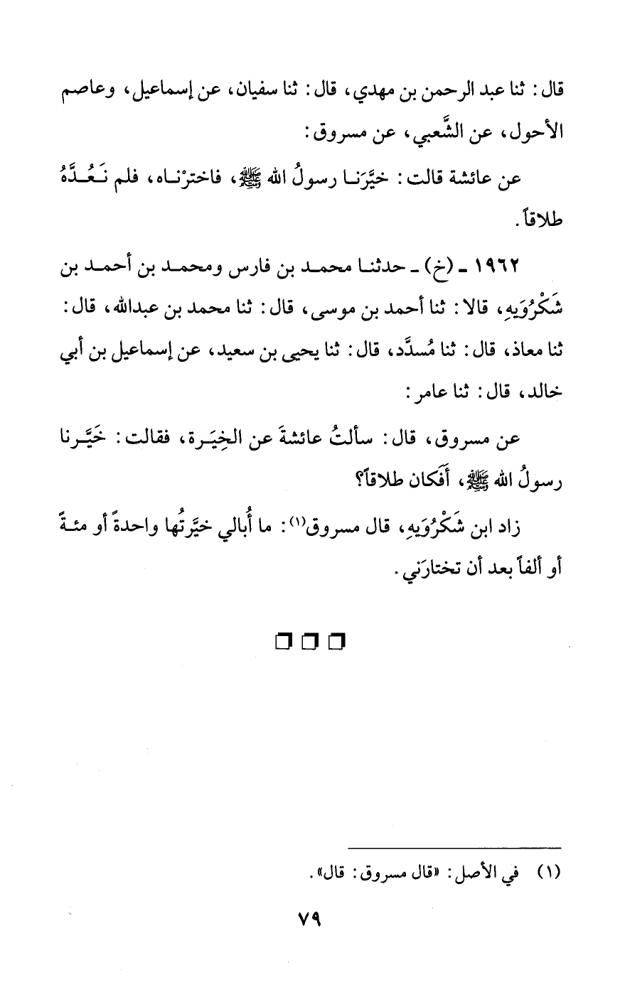 عن مسروق، قال: سألت عائشة عن الخيرة، فقالت: خيرنا رسول الله صلى الله عليه وسلم، أفكان طلاقا؟