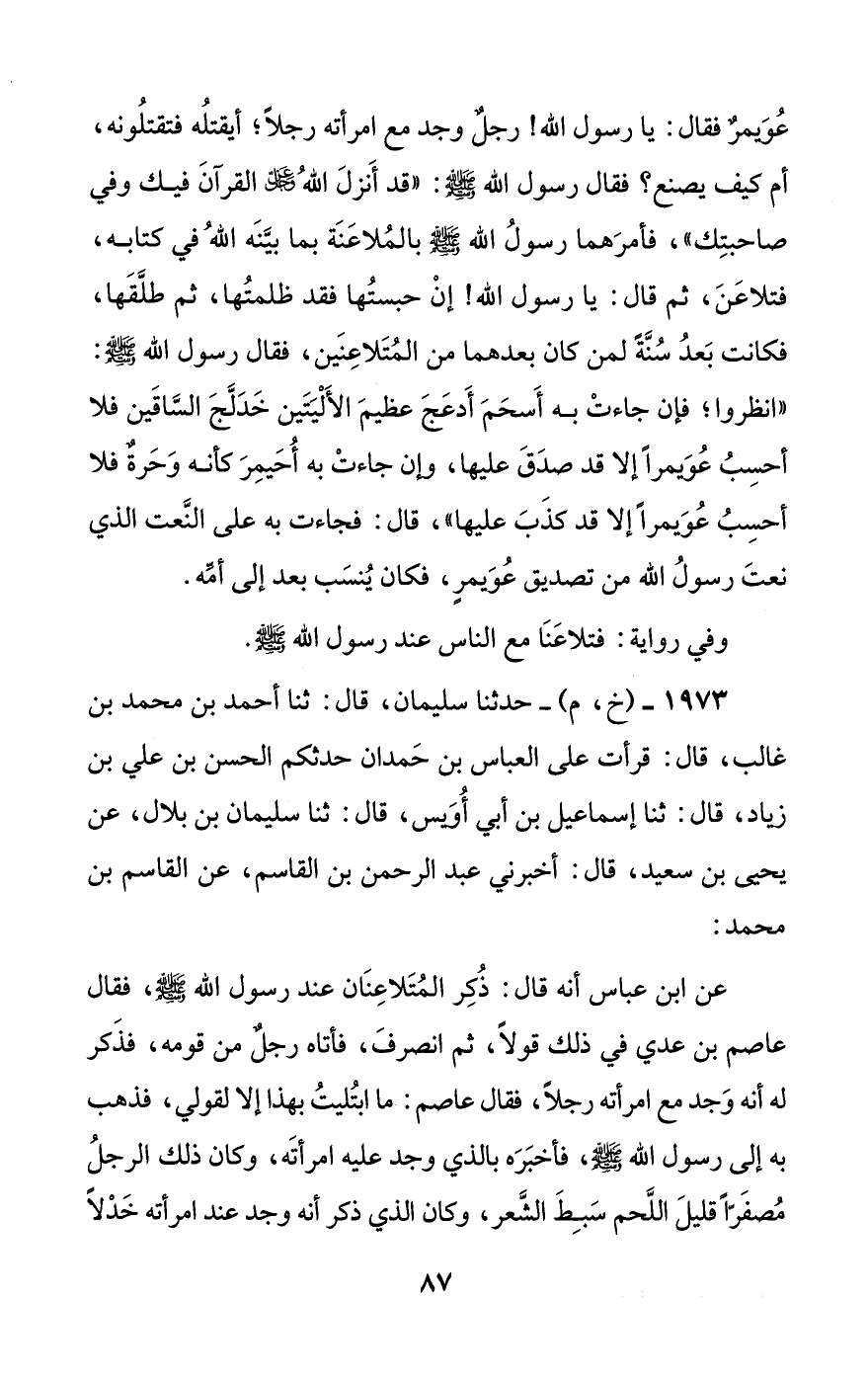 عن ابن عباس أنه قال: ذكر المتلاعنان عند رسول الله صلى الله عليه وسلم، فقال عاصم بن عدي في ذلك قولا، ثم انصرف، فأتاه رجل من قومه، فذكر له أنه وجد مع امرأته رجلا، فقال عاصم: ما ابتليت بهذا إلا لقولي، فذهب به إلى رسول الله صلى الله عليه وسلم، فأخبره بالذي وجد عليه امرأته، وكان ذلك الرجل مصفرا قليل اللحم سبط الشعر، وكان الذي ذكر أنه وجد عند امرأته خدلا #88# آدم كثير اللحم جعدا قططا، فقال رسول الله صلى الله عليه وسلم: ((اللهم بين))، فوضعت شبيها بالرجل الذي ذكر زوجها أنه وجده عندها، فلاعن رسول الله صلى الله عليه وسلم بينهما، فقال رجل لابن عباس في المجلس: أهي التي قال رسول الله صلى الله عليه وسلم: ((لو كنت راجما أحدا بغير بينة لرجمت هذه))؟ قال ابن عباس: لا، تلك امرأة كانت تظهر في الإسلام السوء.