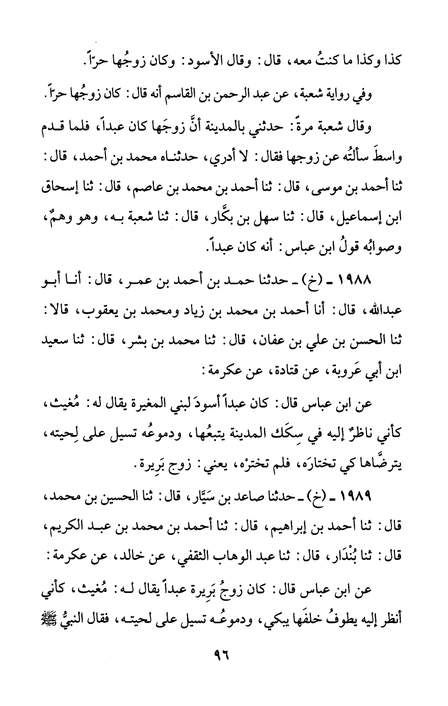1989 - (خ) - حدثنا صاعد بن سيار، قال: ثنا الحسين بن محمد، قال: ثنا أحمد بن إبراهيم، قال: ثنا أحمد بن محمد بن عبد الكريم، قال: ثنا بندار، قال: ثنا عبد الوهاب الثقفي، عن خالد، عن عكرمة: