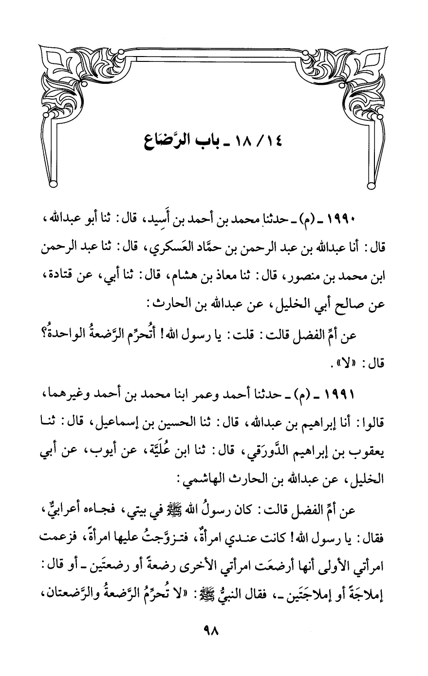 1991 - (م) - حدثنا أحمد وعمر ابنا محمد بن أحمد وغيرهما، قالوا: أنا إبراهيم بن عبد الله، قال: ثنا الحسين بن إسماعيل، قال: ثنا يعقوب بن إبراهيم الدورقي، قال: ثنا ابن علية، عن أيوب، عن أبي الخليل، عن عبد الله بن الحارث الهاشمي.