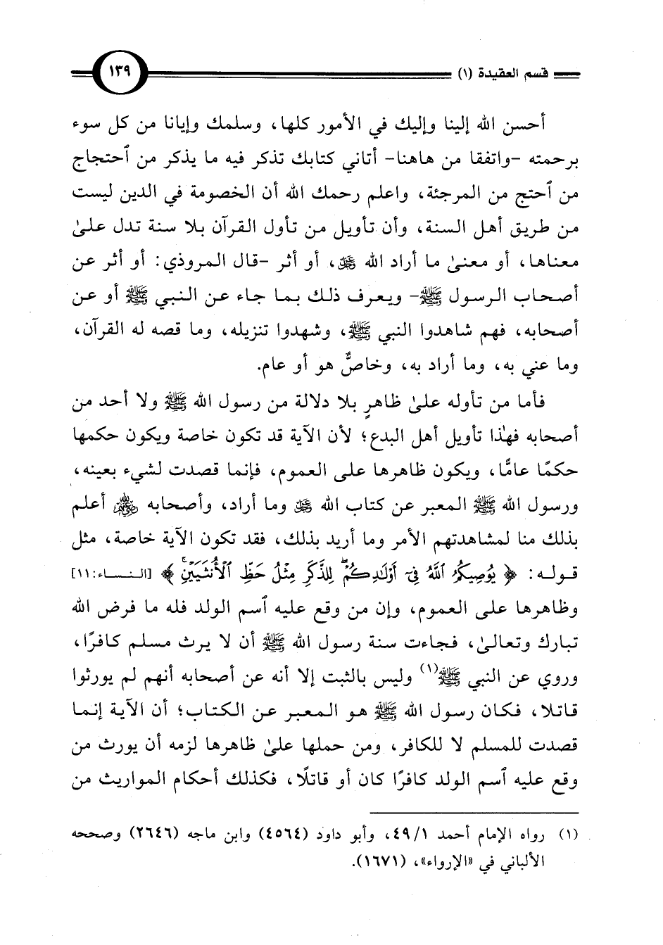 فأما من تأوله على ظاهرٍ بلا دلالة من رسول اللَّه -صلى اللَّه عليه وسلم- ولا أحد من أصحابه فهذا تأويل أهل البدع؛ لأن الآية قد تكون خاصة ويكون حكمها حكمًا عافّا، ويكون ظاهرها على العموم، فإنما قصدت لشيء بعينه، ورسول اللَّه -صلى اللَّه عليه وسلم- المعبر عن كتاب اللَّه عَزَّ وَجَلَّ وما أراد، وأصحابه -رضي اللَّه عنهم- أعلم بذلك منا لمشاهدتهم الأمر وما أريد بذلك، فقد تكون الآية خاصة، مثل قوله: {يُوصِيكُمُ اللَّهُ فِي أَوْلَادِكُمْ لِلذَّكَرِ مِثْلُ حَظِّ الْأُنْثَيَيْنِ} [النساء: 11] وظاهرها على العموم، وإن من وقع عليه اسم الولد فله ما فرض اللَّه تبارك وتعالى، فجاءت سنة رسول اللَّه -صلى اللَّه عليه وسلم- أن لا يرث مسلم كافرًا، وروي عن النبي -صلى اللَّه عليه وسلم- (¬1) وليس بالثبت إلا أنه عن أصحابه أنهم لم يورثوا قاتلا، فكان رسول اللَّه -صلى اللَّه عليه وسلم- هو المعبر عن الكتاب؛ أن الآية إنما قصدت للمسلم لا للكافر، ومن حملها على ظاهرها لزمه أن يورث من وقع عليه اسم الولد كافرًا كان أو قاتلًا، فكذلك أحكام المواريث من
