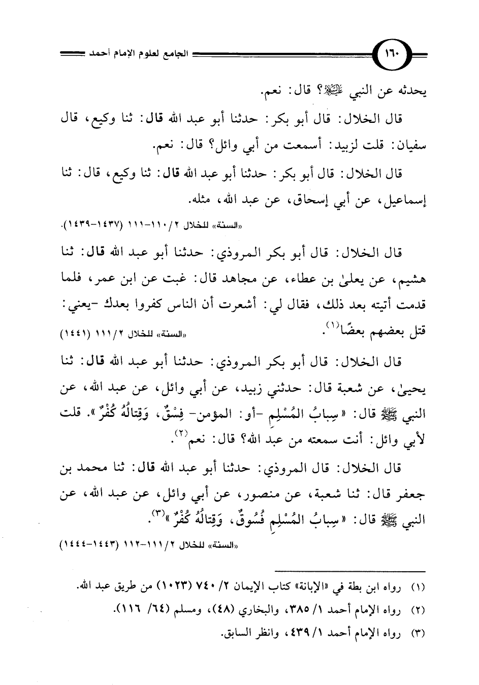 قال الخلال: قال المروذي: حدثنا أبو عبد اللَّه قال: ثنا محمد بن جعفر قال: ثنا شعبة، عن منصور، عن أبي وائل، عن عبد اللَّه، عن النبي -صلى اللَّه عليه وسلم- قال: "سِبابُ المُسْلِمِ فُسُوقٌ، وَقِتالُهُ كُفْرٌ" (¬3).