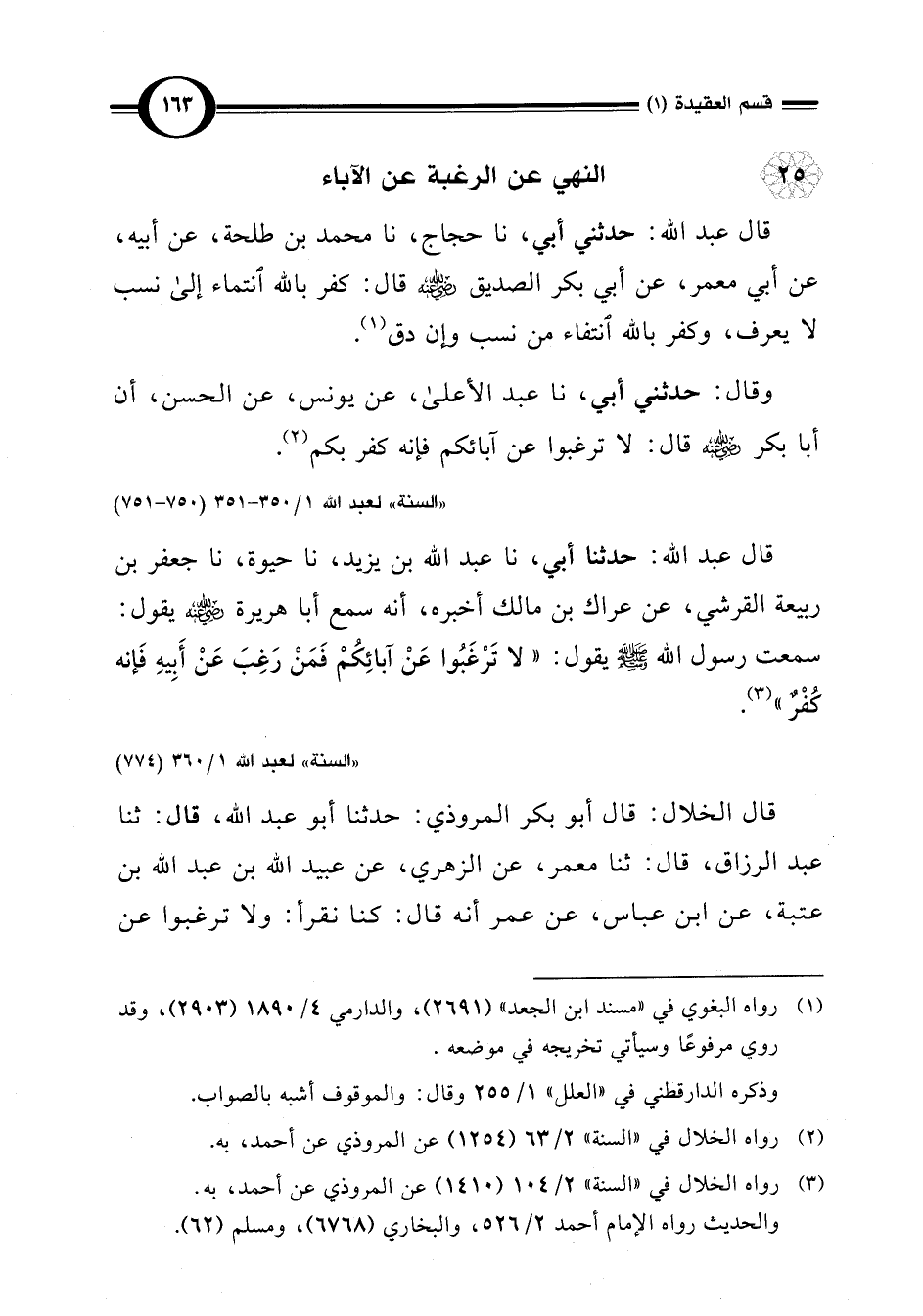 قال عبد اللَّه: حدثنا أبي، نا عبد اللَّه بن يزيد، نا حيوة، نا جعفر بن ربيعة القرشي، عن عراك بن مالك أخبره، أنه سمع أبا هريرة رضي اللَّه عنه يقول: سمعت رسول اللَّه -صلى اللَّه عليه وسلم- يقول: "لا تَرْغَبُوا عَنْ آبائِكُمْ فَمَنْ رَغِبَ عَنْ أَبِيهِ فَإنَّه كُفْرٌ" (¬3).
