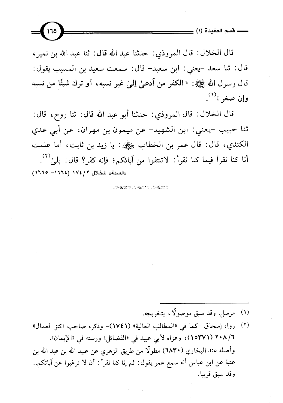 قال الخلال: قال المروذي: حدثنا عبد اللَّه قال: ثنا عبد اللَّه بن نمير، قال: ثنا سعد -يعني: ابن سعيد- قال: سمعت سعيد بن المسيب يقول: قال رسول اللَّه -صلى اللَّه عليه وسلم-: "الكفر من ادعى إلى غير نسبه، أو ترك شيئًا من نسبه وإن صغر" (¬1).