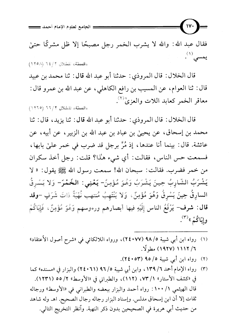 قال الخلال: قال المروذي: حدثنا أبو عبد اللَّه قال: ثنا يزيد، قال: ثنا محمد بن إسحاق، عن يحيى بن عباد بن عبد اللَّه بن الزبير، عن أبيه، عن عائشة. قال: بينما أنا عندها، إذ مُرَّ برجل قد ضرب في خمر على بابها، فسمعت حس الناس، فقالت: أي شيء هذا؟ قلت: رجل أخذ سكران من خمر فضرب. فقالت: سبحان اللَّه! سمعت رسول اللَّه -صلى اللَّه عليه وسلم- يقول: "لَا يَشْرَبُ الشَّارِبُ حِينَ يَشْرَبُ وَهُوَ مُؤْمِنٌ -يَعْنِي الْخَمْرَ- وَلَا يَسْرِقُ السَّارِقُ حِينَ يَسْرِقُ وَهُوَ مُؤْمِنٌ، وَلَا يَنْتَهِبُ مُنْتَهِبٌ نُهْبَةً ذَاتَ شَرَفٍ -وقد قال: شرف- يَرْفَعُ النَّاسُ إِلَيْهِ فِيهَا أَبْصَارهم ورُءُوسَهُمْ وَهُوَ مُؤْمِنٌ، فَإِيَّاكُمْ وَإِيَّاكُمْ" (¬3).