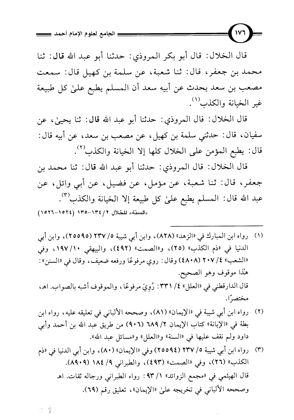 قال الخلال: قال المروذي: حدثنا أبو عبد اللَّه قال: ثنا محمد بن جعفر، قال: ثنا شعبة، عن مؤمل، عن فضيل، عن أبي وائل، عن عبد اللَّه قال: المسلم يطبع على كل طبيعة إلا الخيانة والكذب (¬3).