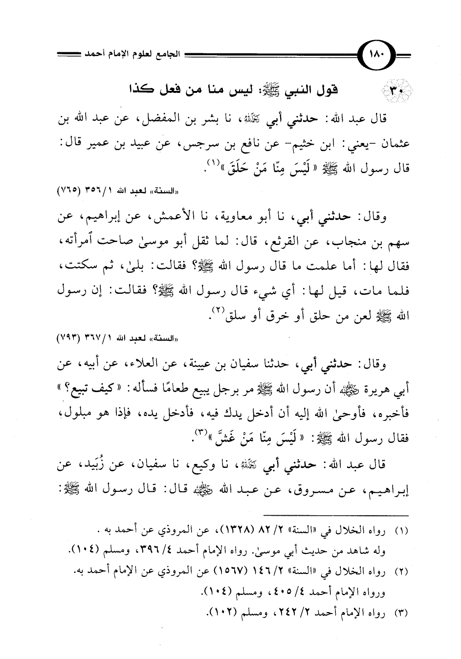 قال عبد اللَّه: حدثني أبي رحمه اللَّه، نا بشر بن المفضل، عن عبد اللَّه بن عثمان -يعني: ابن خثيم- عن نافع بن سرجس، عن عبيد بن عمير قال: قال رسول اللَّه -صلى اللَّه عليه وسلم- "لَيْسَ مِنّا مَنْ حَلَقَ" (¬1).