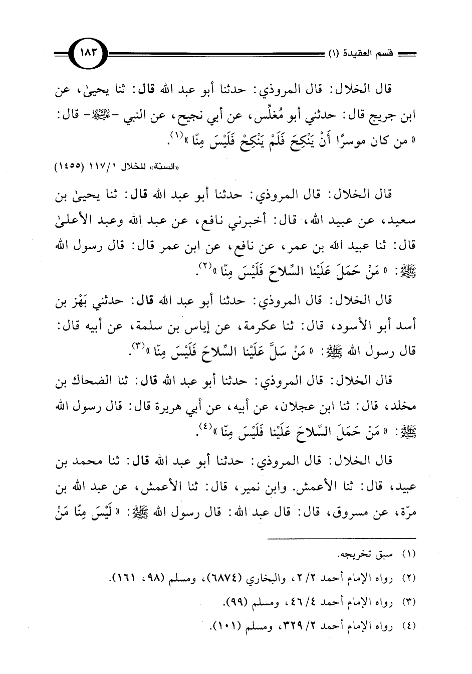 قال الخلال: قال المروذي: حدثنا أبو عبد اللَّه قال: ثنا يحيى بن سعيد، عن عبيد اللَّه، قال: أخبرني نافع، عن عبد اللَّه وعبد الأعلى قال: ثنا عبيد اللَّه بن عمر، عن نافع، عن ابن عمر قال: قال رسول اللَّه -صلى اللَّه عليه وسلم-: "مَن حَمَلَ عَلَيْنا السِّلاحَ فَلَيسَ مِنّا" (¬2).