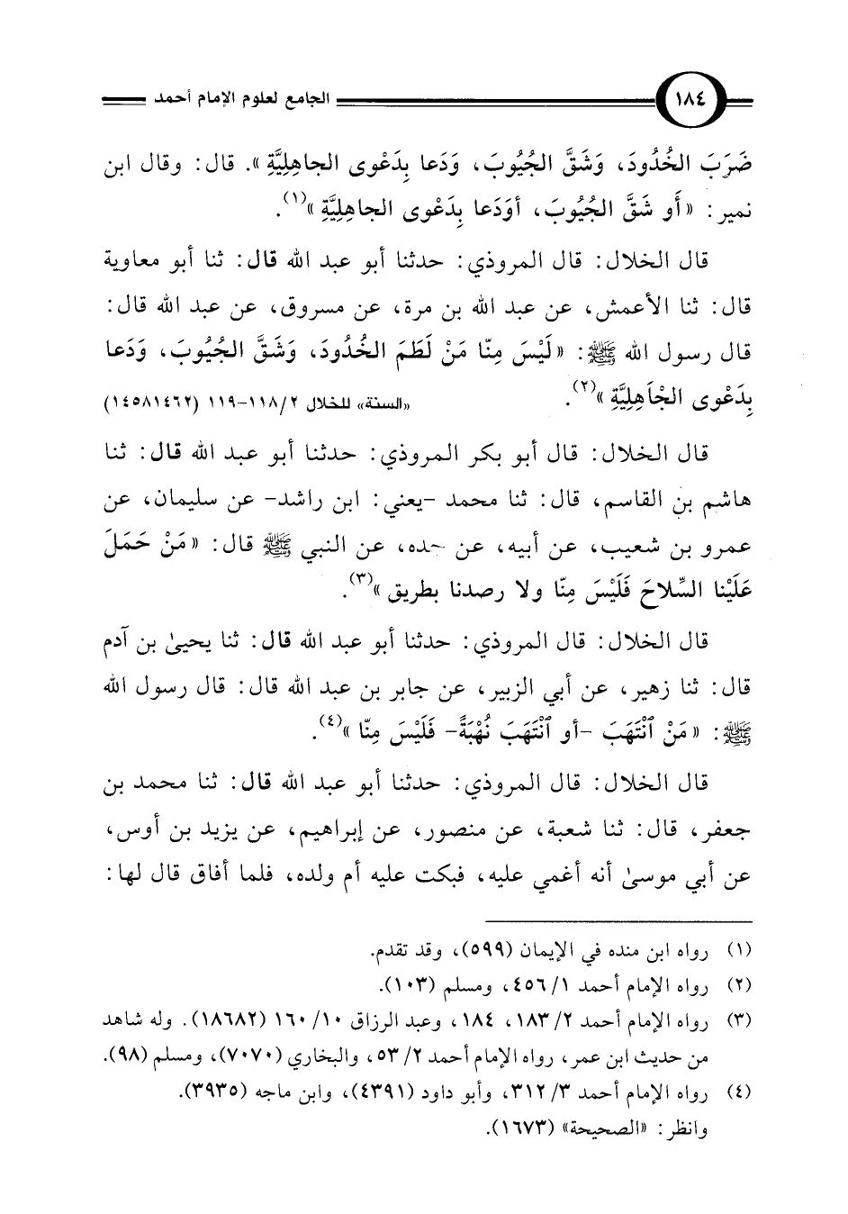 قال الخلال: قال المروذي: حدثنا أبو عبد اللَّه قال: ثنا أبو معاوية قال: ثنا الأعمش، عن عبد اللَّه بن مرة، عن مسروق، عن عبد اللَّه قال: قال رسول اللَّه -صلى اللَّه عليه وسلم-: "لَيسَ مِنّا مَن لَطَمَ الخدُودَ، وَشَقَّ الجُيُوبَ، وَدَعا بِدَعْوى الجَاهِلِيَّة" (¬2).