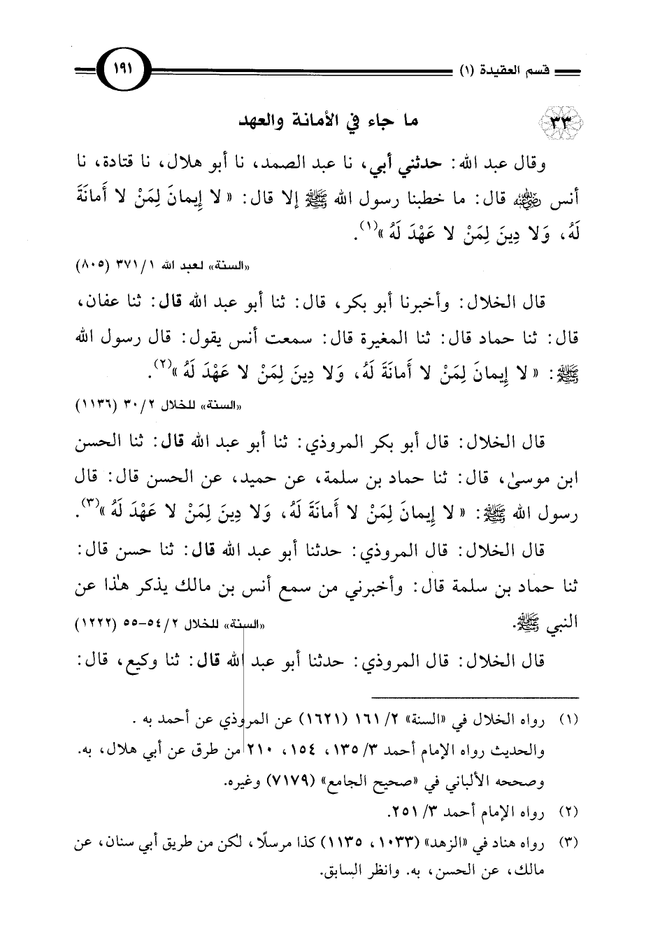 قال الخلال: وأخبرنا أبو بكر، قال: ثنا أبو عبد اللَّه قال: ثنا عفان، قال: ثنا حماد قال: ثنا المغيرة قال: سمعت أنس يقول: قال رسول اللَّه -صلى اللَّه عليه وسلم-: "لا إِيمانَ لِمَنْ لا أَمانَةَ لَهُ، وَلا دِينَ لِمَنْ لا عَهْدَ لَهُ" (¬2).