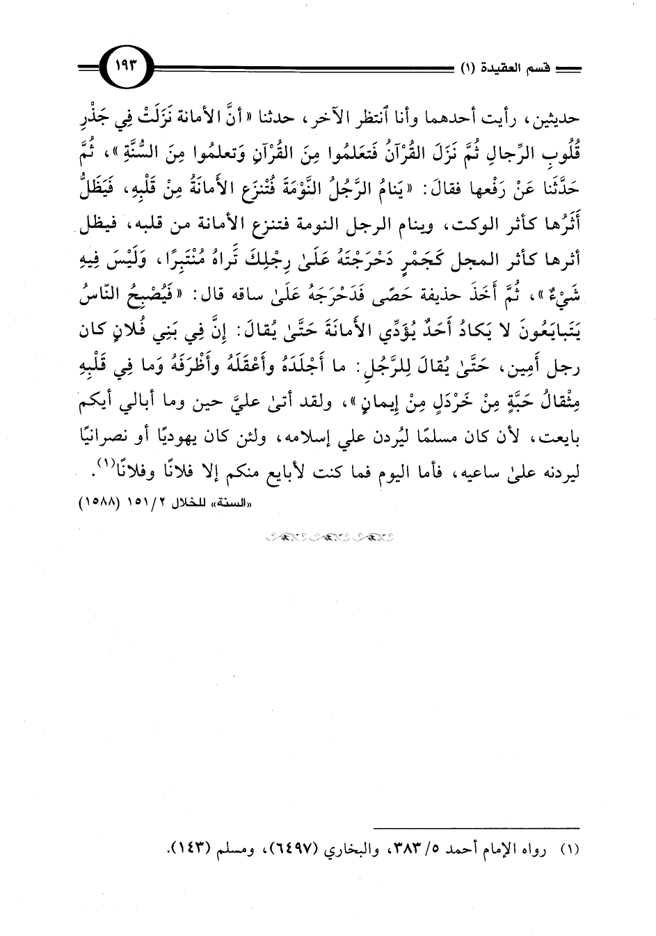 حديثين، رأيت أحدهما وأنا أنتظر الآخر، حدثنا "أنَّ الأمانة نَزَلَتْ فِي جَذْرِ قُلُوبِ الرِّجالِ ثُمَّ نَزَلَ القُرْآنُ فَتعَلمُوا مِنَ القُرْآنِ وَتعلمُوا مِنَ السُّنَّةِ"، ثُمَّ حَدَّثَنا عَنْ رَفْعها فقالَ: "يَنامُ الرَّجُلُ النَّوْمَةَ فُتْنزَع الأَمانَةُ مِنْ قَلْبِهِ، فَيَظَلُّ أَثَرُها كأثر الوكت، وينام الرجل النومة فتنزع الأمانة من قلبه، فيظل أثرها كأثر المجل كَجَمْرٍ دَحْرَجْتَهُ عَلَى رِجْلِكَ تَراهُ مُنْتَبِرًا، وَلَيْسَ فِيهِ شَيْءٌ"، ثُمَّ أَخَذَ حذيفة حَصًى فَدَحْرَجَهُ عَلَى ساقه قال: "فَيُصْبِحُ النّاسُ يَتَبايَعُونَ لا يَكادُ أَحَدٌ يُؤَدِّي الأَمانَةَ حَتَّى يُقالَ: إِنَّ فِي بَنِي فُلانٍ رجل أَمِين، حَتَّى يُقالَ لِلرَّجُلِ: ما أَجْلَدَهُ وأَعْقَلَهُ وأَظْرَفَهُ وَما فِي قَلْبِهِ مِثْقالُ حَبَّةٍ مِنْ خَرْدَلٍ مِنْ إِيمانٍ"، ولقد أتى عليَّ حين وما أبالي أيكم بايعت، لأن كان مسلمًا ليُردن علي إسلامه، ولئن كان يهوديًا أو نصرانيًا ليردنه على ساعيه، فأما اليوم فما كنت لأبايع منكم إلا فلانًا وفلانًا (¬1).
