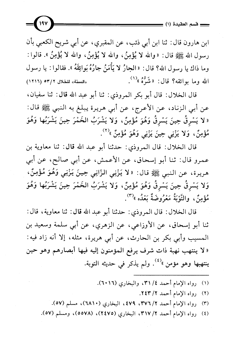 قال الخلال: قال أبو بكر المروذي: ثنا أبو عبد اللَّه قال: ثنا سفيان، عن أبي الزناد، عن الأعرج، عن أبي هريرة يبلغ به النبي -صلى اللَّه عليه وسلم- قال: "لا يَسْرِقُ حِينَ يَسْرِقُ وَهُوَ مُؤْمِنٌ، وَلا يَشْرَبُ الخَمْرَ حِينَ يَشْرَبُها وَهُوَ مُؤْمِنٌ، وَلا يَزْنِي حِينَ يَزْنِي وَهُوَ مُؤْمِنٌ" (¬2).