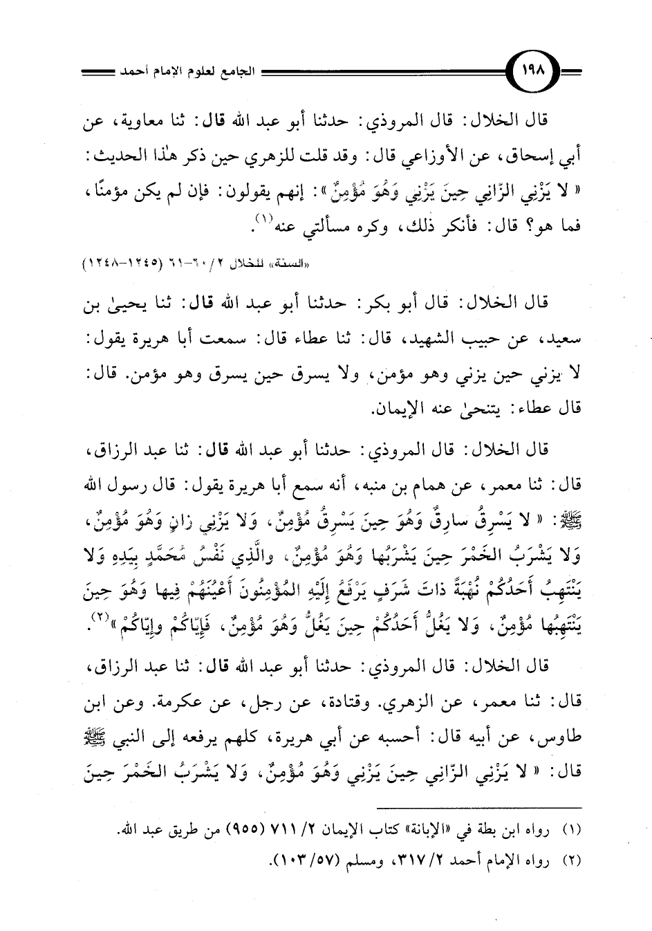 قال الخلال: قال المروذي: حدثنا أبو عبد اللَّه قال: ثنا عبد الرزاق، قال: ثنا معمر، عن همام بن منبه، أنه سمع أبا هريرة يقول: قال رسول اللَّه -صلى اللَّه عليه وسلم-: "لَا يَسْرِقُ سَارِقٌ وَهُوَ حِينَ يَسْرِقُ مُؤْمِنٌ، وَلَا يَزْنِي زَانٍ وَهُوَ مُؤْمِنٌ، وَلَا يَشْرَبُ الْخَمْرَ حِينَ يَشْرَبُهَا وَهُوَ مُؤْمِنٌ، وَالَّذِي نَفْسُ مُحَمَّدٍ بِيَدِهِ وَلَا يَنْتَهِبُ أَحَدُكُمْ نَهْبَةً ذَاتَ شَرَفٍ يَرْفَعُ إِلَيْهِ الْمُؤْمِنُونَ أَعْيُنَهُمْ فِيهَا وَهُوَ حِينَ يَنْتَهِبُهَا مُؤْمِنٌ، وَلَا يَغُلُّ أَحَدُكُمْ حِينَ يَغُلُّ وَهُوَ مُؤْمِنٌ، فَإِيَّاكُمْ وَإِيَّاكُمْ" (¬2).