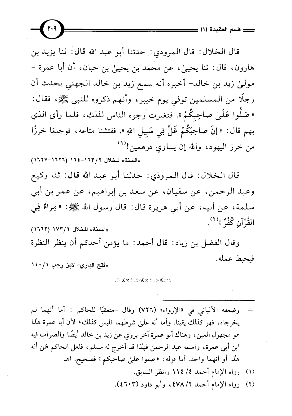 قال الخلال: قال المروذي: حدثنا أبو عبد اللَّه قال: ثنا يزيد بن هارون، قال: ثنا يحيى، عن محمد بن يحيى بن حبان، أن أبا عمرة -مولى زيد بن خالد- أخبره أنه سمع زيد بن خالد الجهني يحدث أن رجلًا من المسلمين توفي يوم خيبر، وأنهم ذكروه للنبي -صلى اللَّه عليه وسلم-، فقال: "صَلُّوا عَلَى صاحِبِكُمْ". فتغيرت وجوه الناس لذلك، فلما رأى الذي بهم قال: "إنَّ صاحِبَكُمْ غَلَّ فِي سَبِيلِ اللَّهِ". ففتشنا متاعه، فوجدنا خرزًا من خرز اليهود، واللَّه إن يساوي درهمين! (¬1)