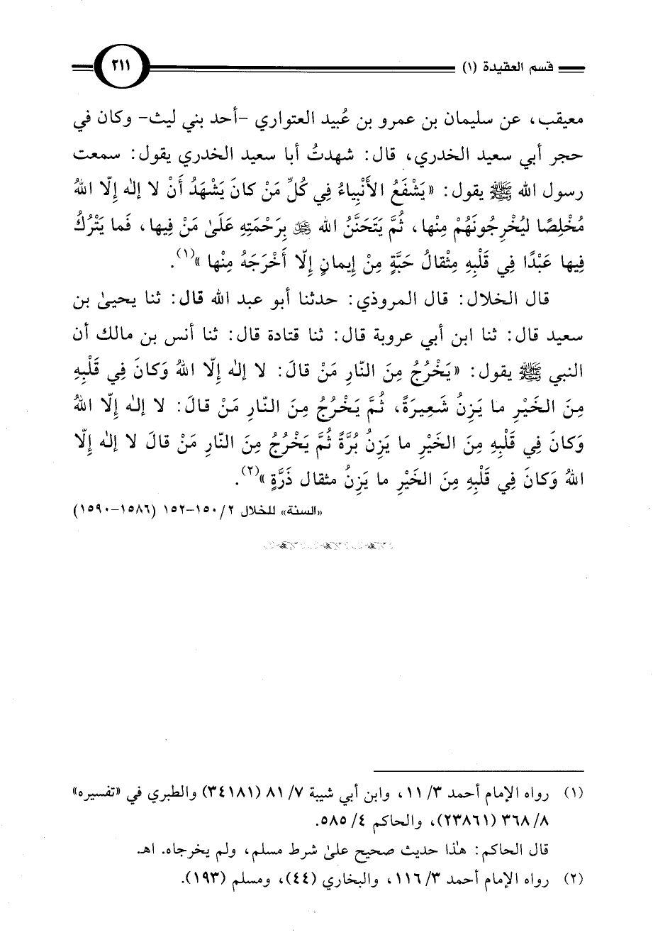 قال الخلال: قال المروذي: حدثنا أبو عبد اللَّه قال: ثنا يحيى بن سعيد قال: ثنا ابن أبي عروبة قال: ثنا قتادة قال: ثنا أنس بن مالك أن النبي -صلى اللَّه عليه وسلم- يقول: "يَخْرُجُ مِنَ النّارِ مَنْ قالَ: لا إله إِلّا اللَّهُ وَكانَ فِي قَلْبِهِ مِنَ الخَيْرِ ما يَزِنُ شَعِيرَةً، ثُمَّ يَخْرُجُ مِنَ النّارِ مَنْ قالَ: لا إله إِلّا اللَّهُ وَكانَ فِي قَلْبِهِ مِنَ الخَيْرِ ما يَزِنُ بُرَّةً تُمَّ يَخْرُجُ مِنَ النّارِ مَنْ قالَ لا إله إِلّا اللَّهُ وَكانَ فِي قَلْبِهِ مِنَ الخَيْرِ ما يَزِنُ مثقَال ذَرَّةٍ" (¬2).