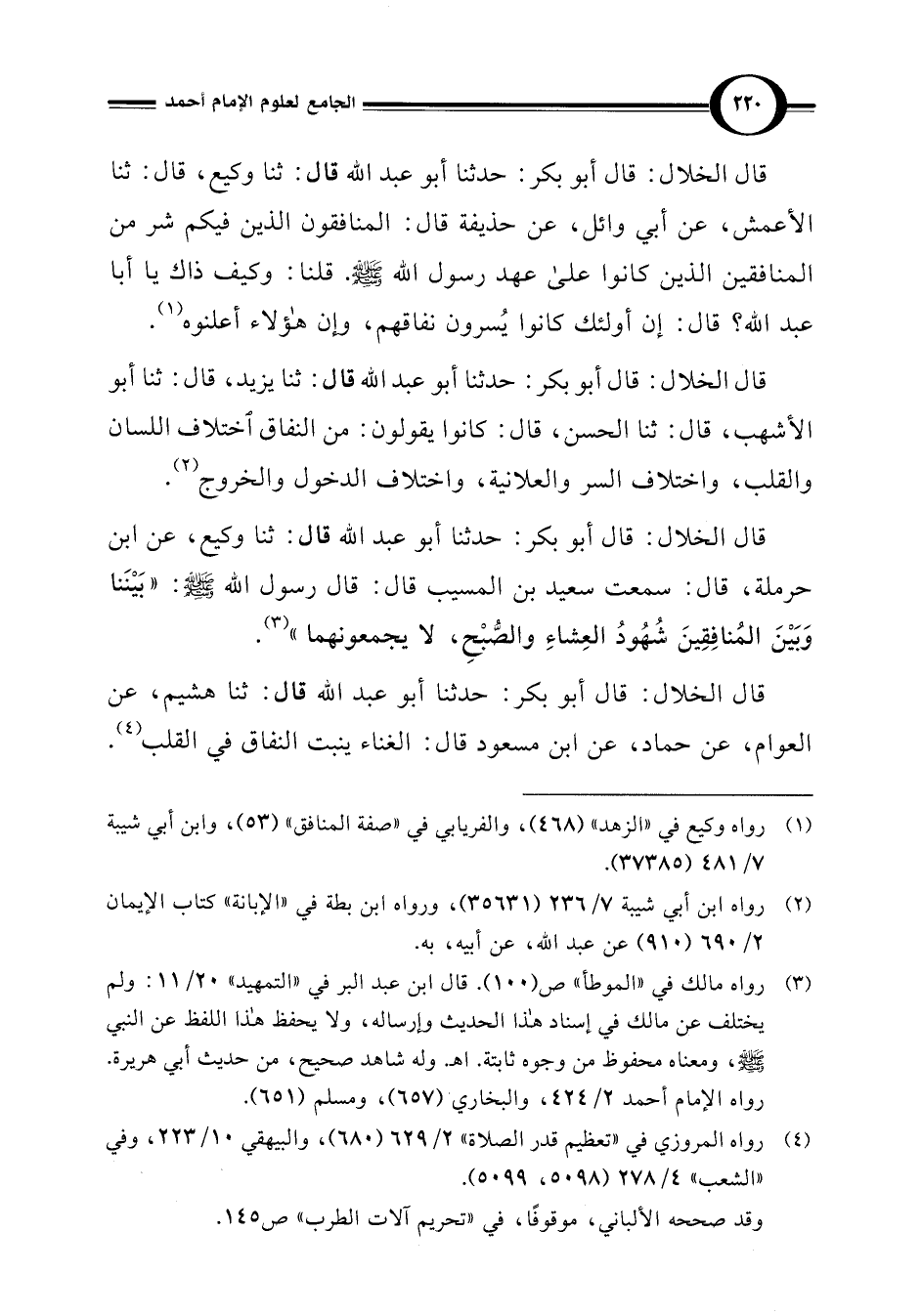 قال الخلال: قال أبو بكر: حدثنا أبو عبد اللَّه قال: ثنا وكيع، قال: ثنا الأعمش، عن أبي وائل، عن حذيفة قال: المنافقون الذين فيكم شر من المنافقين الذين كانوا على عهد رسول اللَّه -صلى اللَّه عليه وسلم-. قلنا: وكيف ذاك يا أبا عبد اللَّه؟ قال: إن أولئك كانوا يُسرون نفاقهم، وإن هؤلاء أعلنوه (¬1).