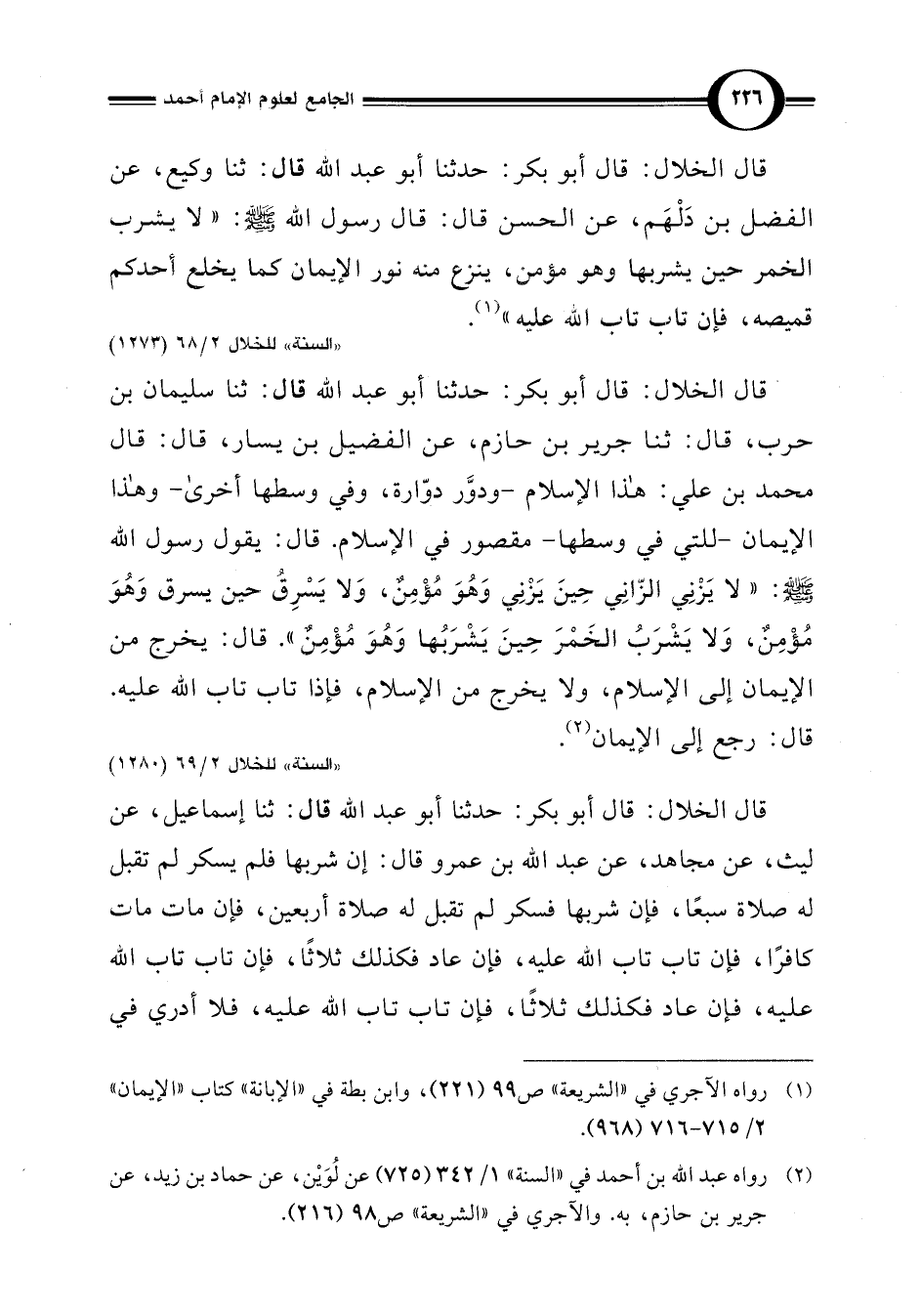 قال الخلال: قال أبو بكر: حدثنا أبو عبد اللَّه قال: ثنا وكيع، عن الفضل بن دَلْهَم، عن الحسن قال: قال رسول اللَّه -صلى اللَّه عليه وسلم-: "لا يشرب الخمر حين يشربها وهو مؤمن، ينزع منه نور الإيمان كما يخلع أحدكم قميصه، فإن تاب تاب اللَّه عليه" (¬1).