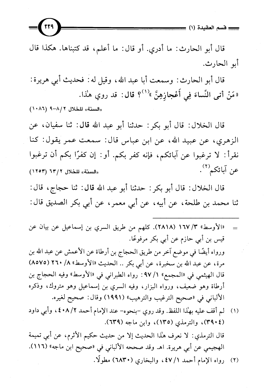 قال الخلال: قال أبو بكر: حدثنا أبو عبد اللَّه قال: ثنا حجاج، قال: ثنا محمد بن طلحة، عن أبيه، عن أبي معمر، عن أبي بكر الصديق قال: