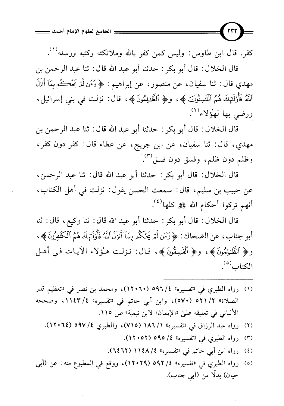 قال الخلال: قال أبو بكر: حدثنا أبو عبد اللَّه قال: ثنا عبد الرحمن بن مهدي قال: ثنا سفيان، عن منصور، عن إبراهيم: {وَمَنْ لَمْ يَحْكُمْ بِمَا أَنْزَلَ اللَّهُ فَأُولَئِكَ هُمُ الفَاسِقُونَ}، {الظَّالِمُونَ}، قال: نزلت في بني إسرائيل، ورضي بها لهؤلاء (¬2).