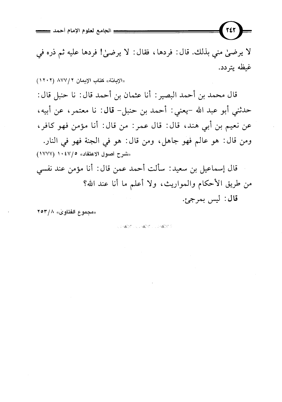 قال إسماعيل بن سعيد: سألت أحمد عمن قال: أنا مؤمن عند نفسي من طريق الأحكام والمواريث، ولا أعلم ما أنا عند اللَّه؟