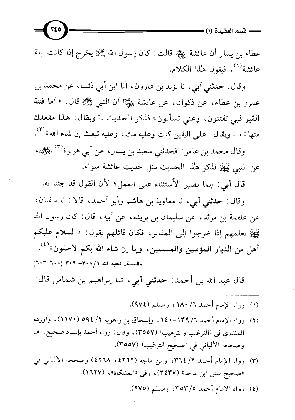 وقال: حدثني أبي، نا معاوية بن هاشم وأبو أحمد، قالا: نا سفيان، عن علقمة بن مرثد، عن سليمان بن بريدة، عن أبيه، قال: كان رسول اللَّه -صلى اللَّه عليه وسلم- يعلمهم إذا خرجوا إلى المقابر، فكان قائلهم يقول: "السلام عليكم أهل من الديار المؤمنين والمسلمين، وإنا إن شاء اللَّه بكم لاحقون" (¬4).