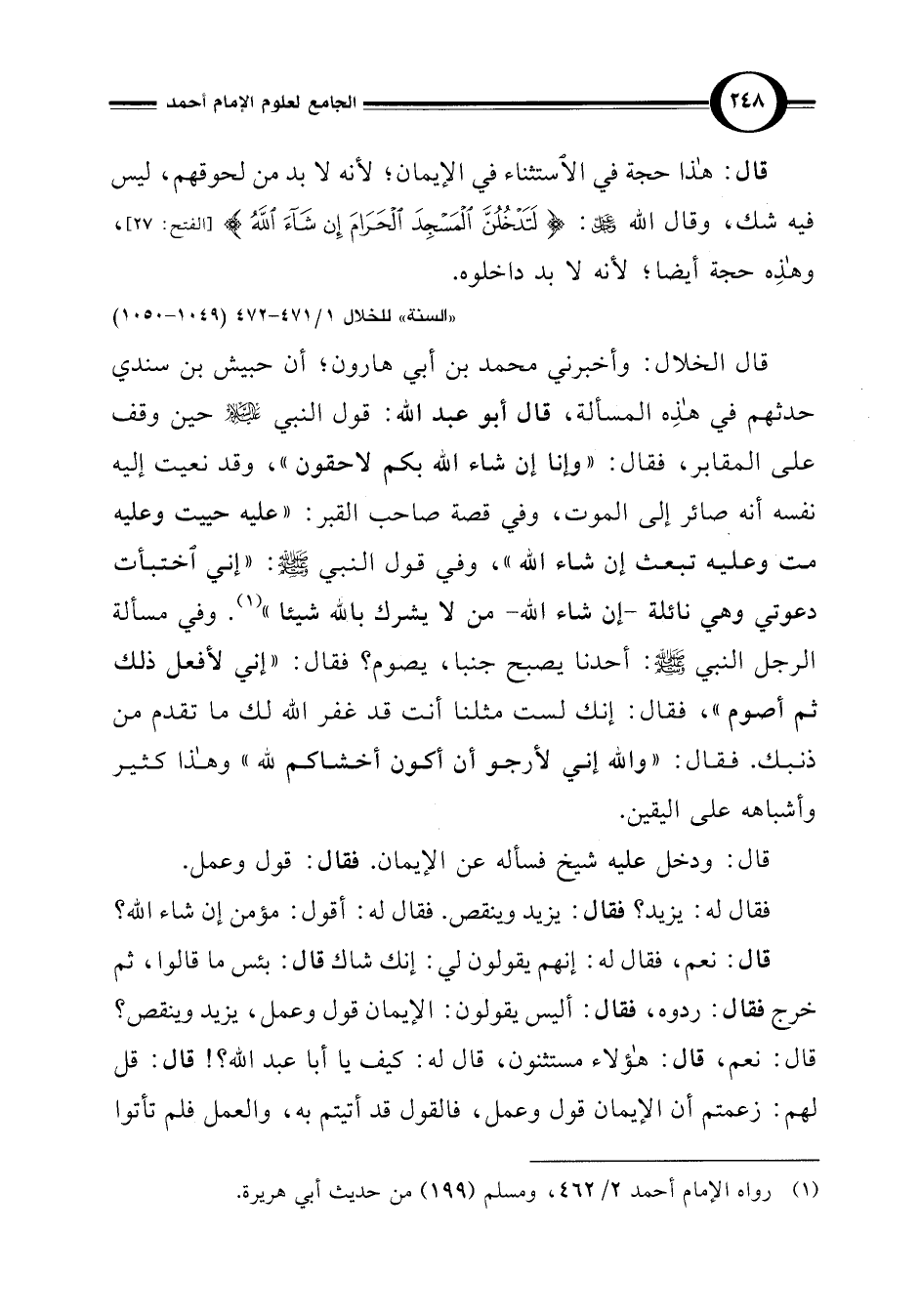 قال الخلال: وأخبرني محمد بن أبي هارون؛ أن حبيش بن سندي حدثهم في هذِه المسألة، قال أبو عبد اللَّه: قول النبي -صلى اللَّه عليه وسلم- حين وقف على المقابر، فقال: "وإنا إن شاء اللَّه بكم لاحقون"، وقد نعيت إليه نفسه أنه صائر إلى الموت، وفي قصة صاحب القبر: "عليه حييت وعليه مت وعليه تبعث إن شاء اللَّه"، وفي قول النبي -صلى اللَّه عليه وسلم-: "إني اختبأت دعوتي وهي نائلة -إن شاء اللَّه- من لا يشرك باللَّه شيئا" (¬1). وفي مسألة الرجل النبي -صلى اللَّه عليه وسلم-: أحدنا يصبح جنبا، يصوم؟ فقال: "إني لأفعل ذلك ثم أصوم"، فقال: إنك لست مثلنا أنت قد غفر اللَّه لك ما تقدم من ذنبك. فقال: "واللَّه إني لأرجو أن أكون أخشاكم للَّه" وهذا كثير وأشباهه على اليقين.