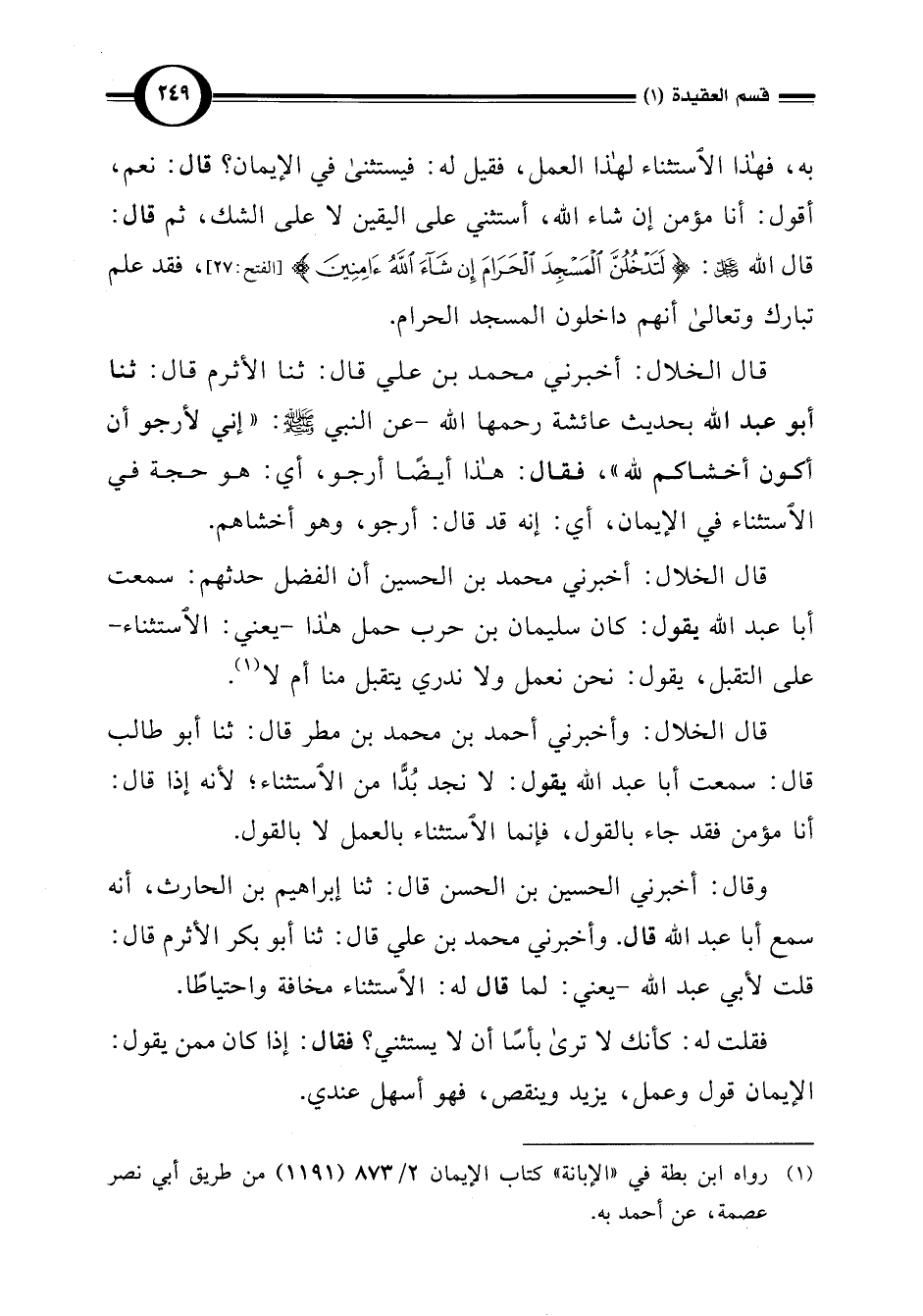 به، فهذا الاستثناء لهذا العمل، فقيل له: فيستثنى في الإيمان؟ قال: نعم، أقول: أنا مؤمن إن شاء اللَّه، أستثني على اليقين لا على الشك، ثم قال: قال اللَّه: {لَتَدْخُلُنَّ الْمَسْجِدَ الْحَرَامَ إِنْ شَاءَ اللَّهُ آمِنِينَ} [الفتح: 27]، فقد علم تبارك وتعالى أنهم داخلون المسجد الحرام.