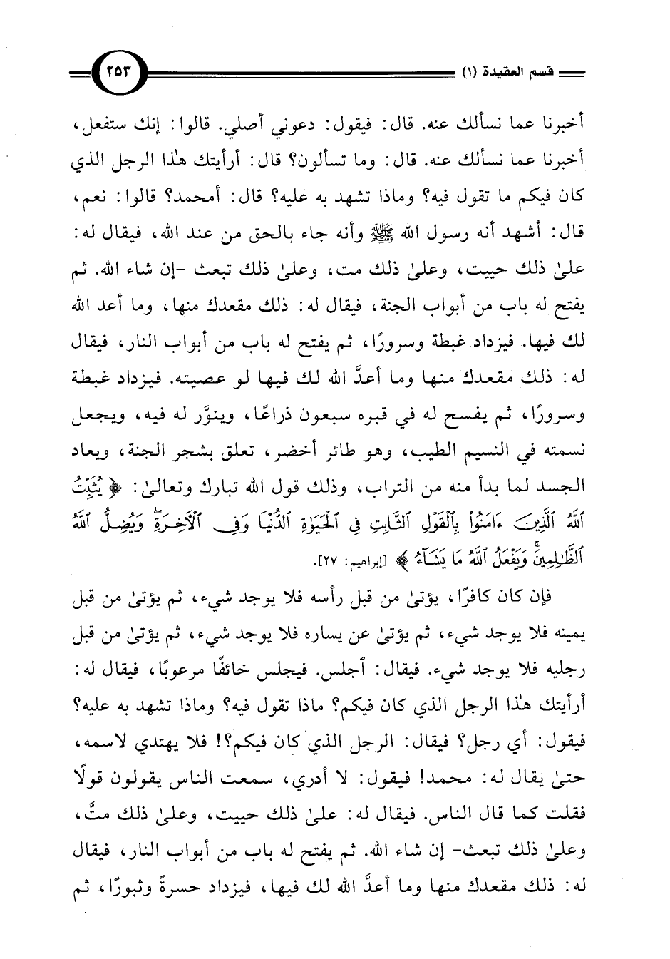 أخبرنا عما نسألك عنه. قال: فيقول: دعوني أصلي. قالوا: إنك ستفعل، أخبرنا عما نسألك عنه. قال: وما تسألون؟ قال: أرأيتك هذا الرجل الذي كان فيكم ما تقول فيه؟ وماذا تشهد به عليه؟ قال: أمحمد؟ قالوا: نعم، قال: أشهد أنه رسول اللَّه -صلى اللَّه عليه وسلم- وأنه جاء بالحق من عند اللَّه، فيقال له: على ذلك حييت، وعلى ذلك مت، وعلى ذلك تبعث -إن شاء اللَّه. ثم يفتح له باب من أبواب الجنة، فيقال له: ذلك مقعدك منها، وما أعد اللَّه لك فيها. فيزداد غبطة وسرورًا، ثم يفتح له باب من أبواب النار، فيقال له: ذلك مقعدك منها وما أعدَّ اللَّه لك فيها لو عصيته. فيزداد غبطة وسرورًا، ثم يفسح له في قبره سبعون ذراعًا، وينوَّر له فيه، ويجعل نسمته في النسيم الطيب، وهو طائر أخضر، تعلق بشجر الجنة، ويعاد الجسد لما بدأ منه من التراب، وذلك قول اللَّه تبارك وتعالى: {يُثَبِّتُ اللَّهُ الَّذِينَ آمَنُوا بِالْقَوْلِ الثَّابِتِ فِي الْحَيَاةِ الدُّنْيَا وَفِي الْآخِرَةِ وَيُضِلُّ اللَّهُ الظَّالِمِينَ وَيَفْعَلُ اللَّهُ مَا يَشَاءُ (27)} [إبراهيم: 27].