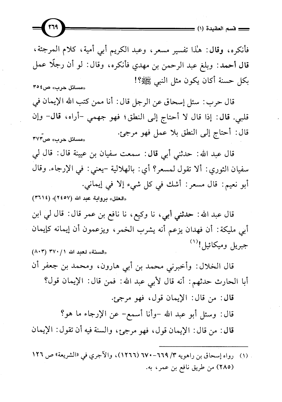 قال عبد اللَّه: حدثني أبي قال: سمعت سفيان بن عيينة قال: قال لي سفيان الثوري: ألا تقول لمسعر؟ أي: بالهلالية -يعني: في الإرجاء. وقال أبو نعيم: قال مسعر: أشك في كل شيء إلا في إيماني.
