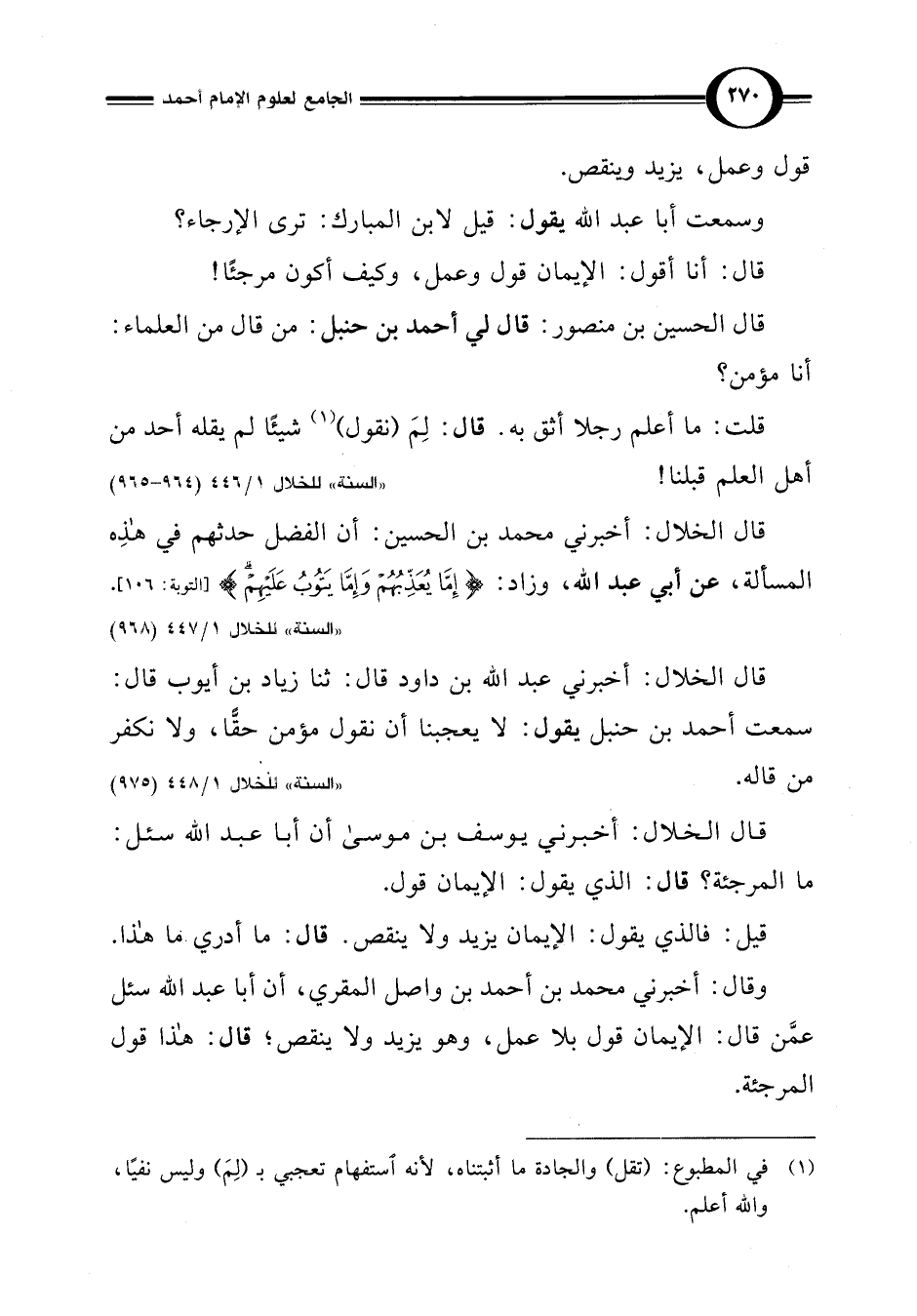 قال الحسين بن منصور: قال لي أحمد بن حنبل: من قال من العلماء: أنا مؤمن؟