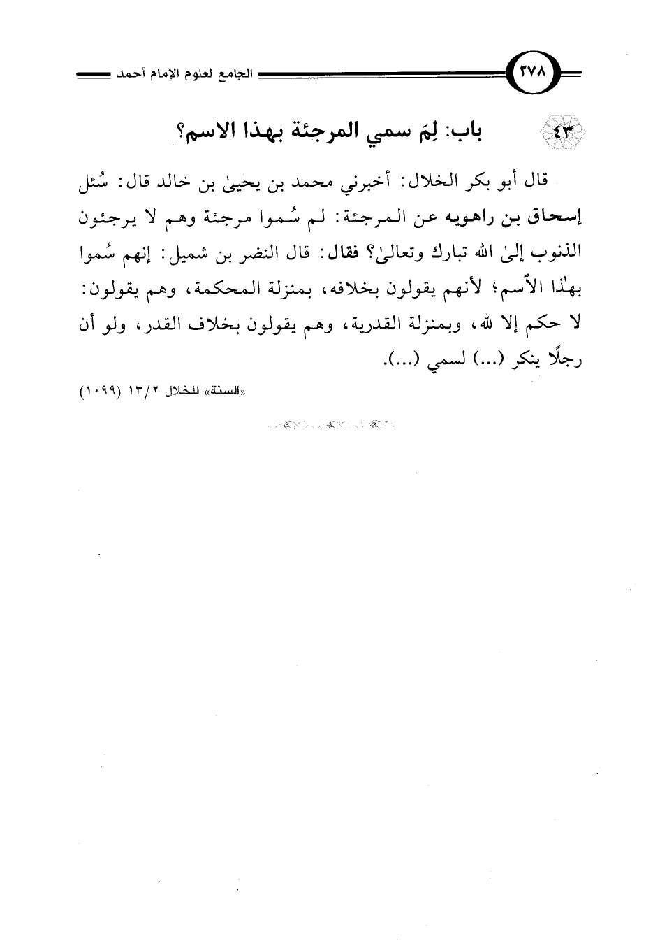 قال أبو بكر الخلال: أخبرني محمد بن يحيى بن خالد قال: سُئل إسحاق بن راهويه عن المرجئة: لم سُموا مرجئة وهم لا يرجئون الذنوب إلى اللَّه تبارك وتعالى؟ فقال: قال النضر بن شميل: إنهم سُموا بهذا الاسم؛ لأنهم يقولون بخلافه، بمنزلة المحكمة، وهم يقولون: لا حكم إلا للَّه، وبمنزلة القدرية، وهم يقولون بخلاف القدر، ولو أن رجلًا ينكر (. . .) لسمي (. . .).