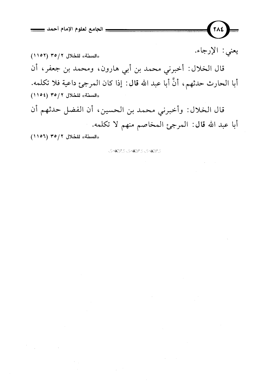 قال الخلال: وأخبرني محمد بن الحسين، أن الفضل حدثهم أن أبا عبد اللَّه قال: المرجئ المخاصم منهم لا تكلمه.