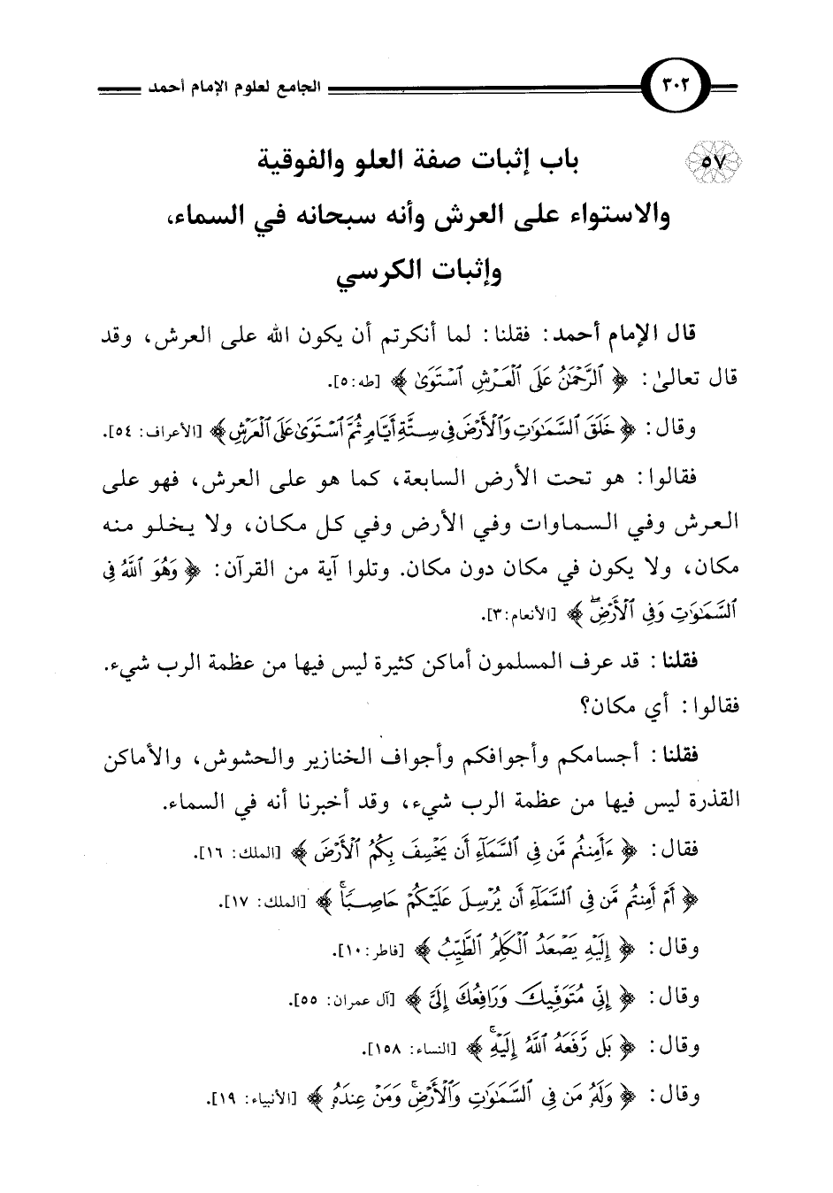 57 - باب إثبات صفة العلو والفوقية والاستواء على العرش وأنه سبحانه في السماء، وإثبات الكرسي