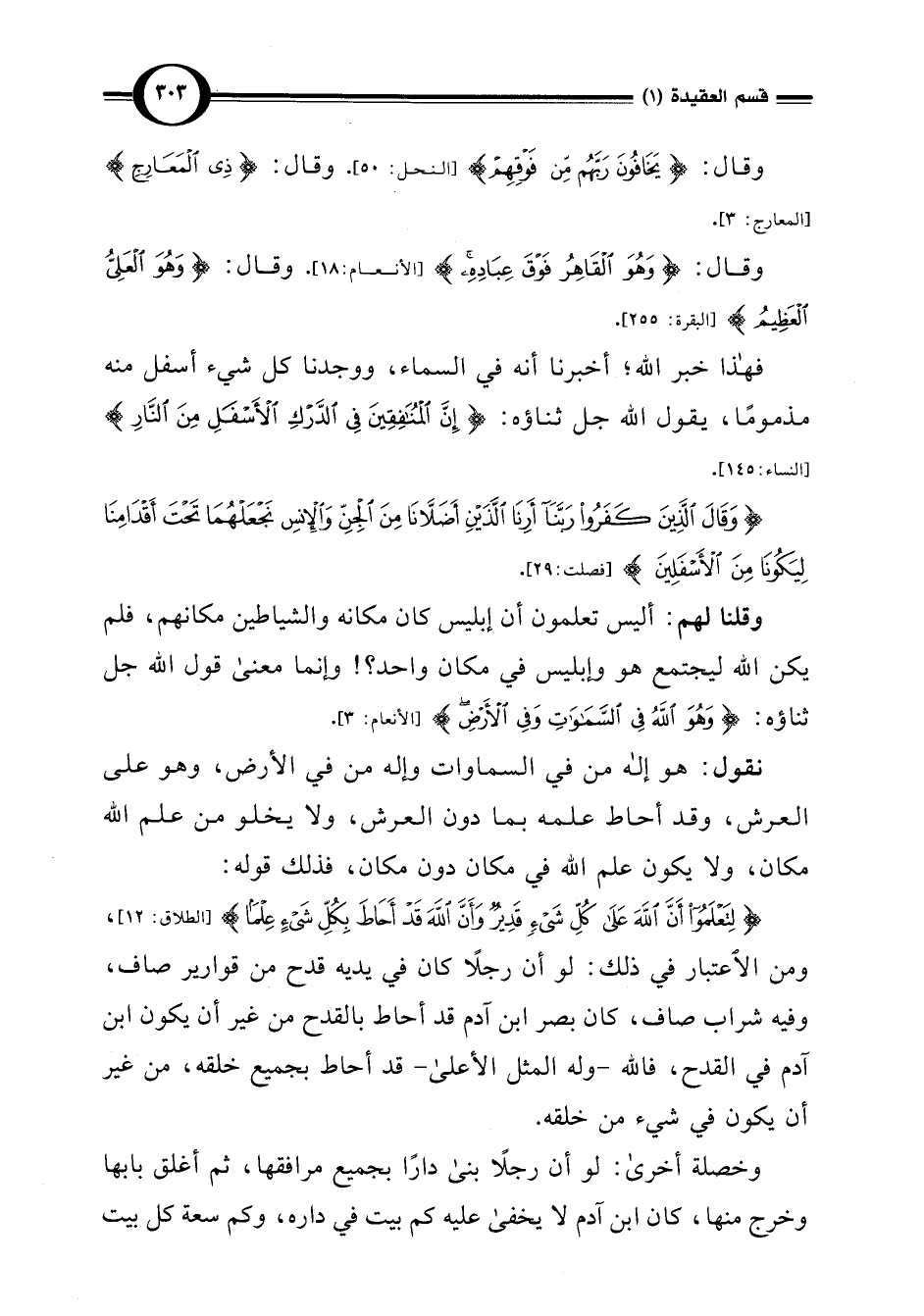 فهذا خبر اللَّه؛ أخبرنا أنه في السماء، ووجدنا كل شيء أسفل منه مذمومًا، يقول اللَّه جل ثناؤه: {إِنَّ الْمُنَافِقِينَ فِي الدَّرْكِ الْأَسْفَلِ مِنَ النَّارِ} [النساء: 145].