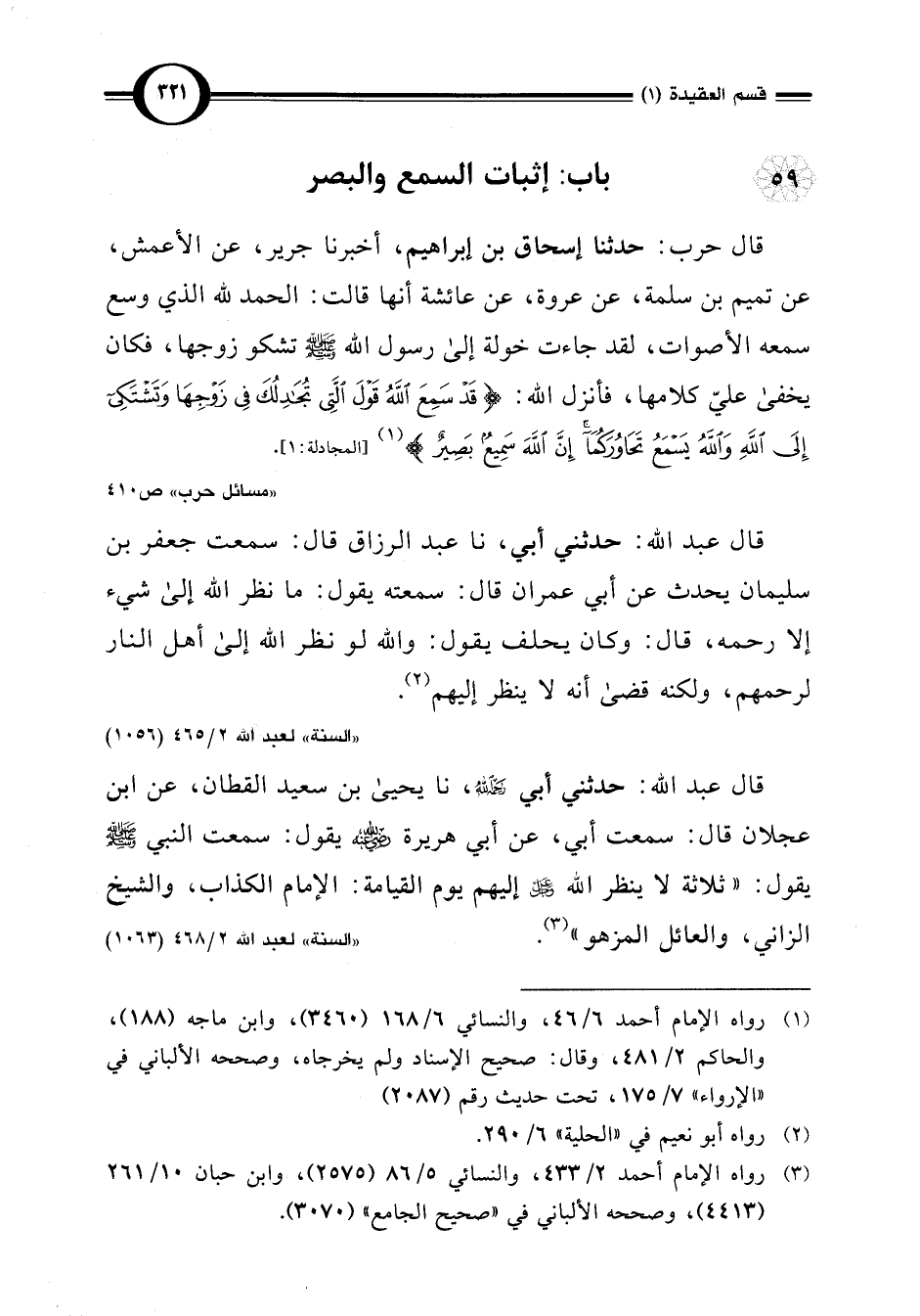 قال حرب: حدثنا إسحاق بن إبراهيم، أخبرنا جرير، عن الأعمش، عن تميم بن سلمة، عن عروة، عن عائشة أنها قالت: الحمد للَّه الذي وسع سمعه الأصوات، لقد جاءت خولة إلى رسول اللَّه -صلى اللَّه عليه وسلم- تشكو زوجها، فكان يخفى عليّ كلامها، فأنزل اللَّه: {قَدْ سَمِعَ اللَّهُ قَوْلَ الَّتِي تُجَادِلُكَ فِي زَوْجِهَا وَتَشْتَكِي إِلَى اللَّهِ وَاللَّهُ يَسْمَعُ تَحَاوُرَكُمَا إِنَّ اللَّهَ سَمِيعٌ بَصِيرٌ (¬1)} [المجادلة: 1].
