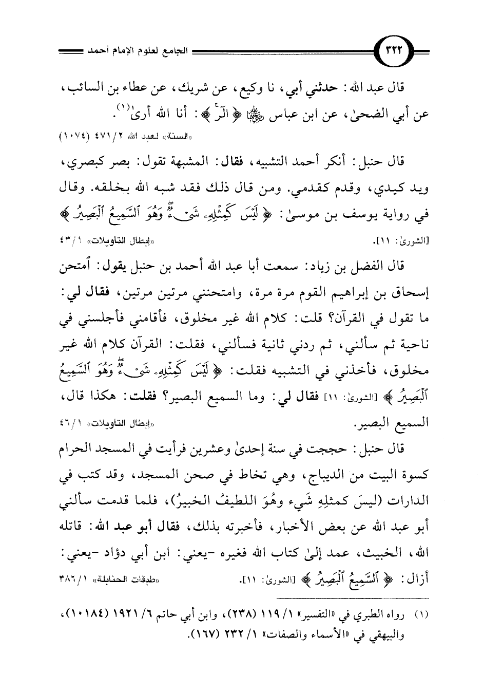 قال حنبل: أنكر أحمد التشبيه، فقال: المشبهة تقول: بصر كبصري، ويد كيدي، وقدم كقدمي. ومن قال ذلك فقد شبه اللَّه بخلقه. وقال في رواية يوسف بن موسى: {لَيْسَ كَمِثْلِهِ شَيْءٌ وَهُوَ السَّمِيعُ الْبَصِيرُ (11)} [الشورى: 11].