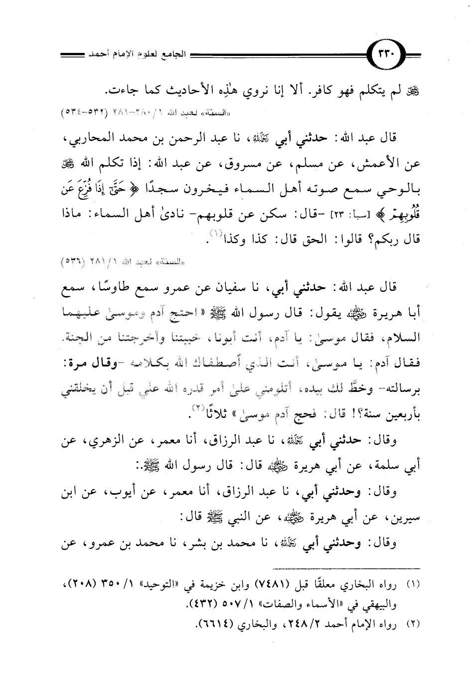 قال عبد اللَّه: حدثني أبي، نا سفيان عن عمرو سمع طاوسًا، سمع أبا هريرة -رضي اللَّه عنه- يقول: قال رسول اللَّه -صلى اللَّه عليه وسلم- "احتج آدم وموسى عليهما السلام، فقال موسى: يا آدم أنت أبونا خيبتنا وأخرجتنا من الجنة. قال آدم: يا موسى، أنت الذي اصطفاك اللَّه بكلامه، -وقال مرة: برسالته- وخطَّ لك بيده، أتلومني على أمر قدره اللَّه علي قبل أن يخلقني بأربعين سنة؟ ! قال: فحج آدم موسى"ثلاثا (¬2).