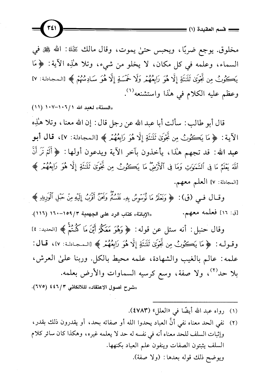 قال أبو طالب: سألت أبا عبد اللَّه عن رجل قال: إن اللَّه معنا، وتلا هذِه الآية: {مَا يَكُونُ مِنْ نَجْوَى ثَلَاثَةٍ إِلَّا هُوَ رَابِعُهُمْ} [المجادلة: 7]، قال أبو عبد اللَّه: قد تجهم هذا، يأخذون بآخر الآية ويدعون أولها: {أَلَمْ تَرَ أَنَّ اللَّهَ يَعْلَمُ مَا فِي السَّمَاوَاتِ وَمَا فِي الْأَرْضِ مَا يَكُونُ مِنْ نَجْوَى ثَلَاثَةٍ إِلَّا هُوَ رَابِعُهُمْ} [المجادلة: 7]، العلم معهم.