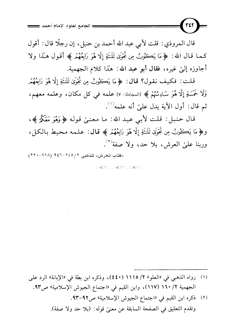 قال المروذي: قلت لأبي عبد اللَّه أحمد بن حنبل، إن رجلًا قال: أقول كما قال اللَّه: {مَا يَكُونُ مِنْ نَجْوَى ثَلَاثَةٍ إِلَّا هُوَ رَابِعُهُمْ} [المجادلة: 7] أقول هذا ولا أجاوزه إلى غيره، فقال أبو عبد اللَّه: هذا كلام الجهمية.