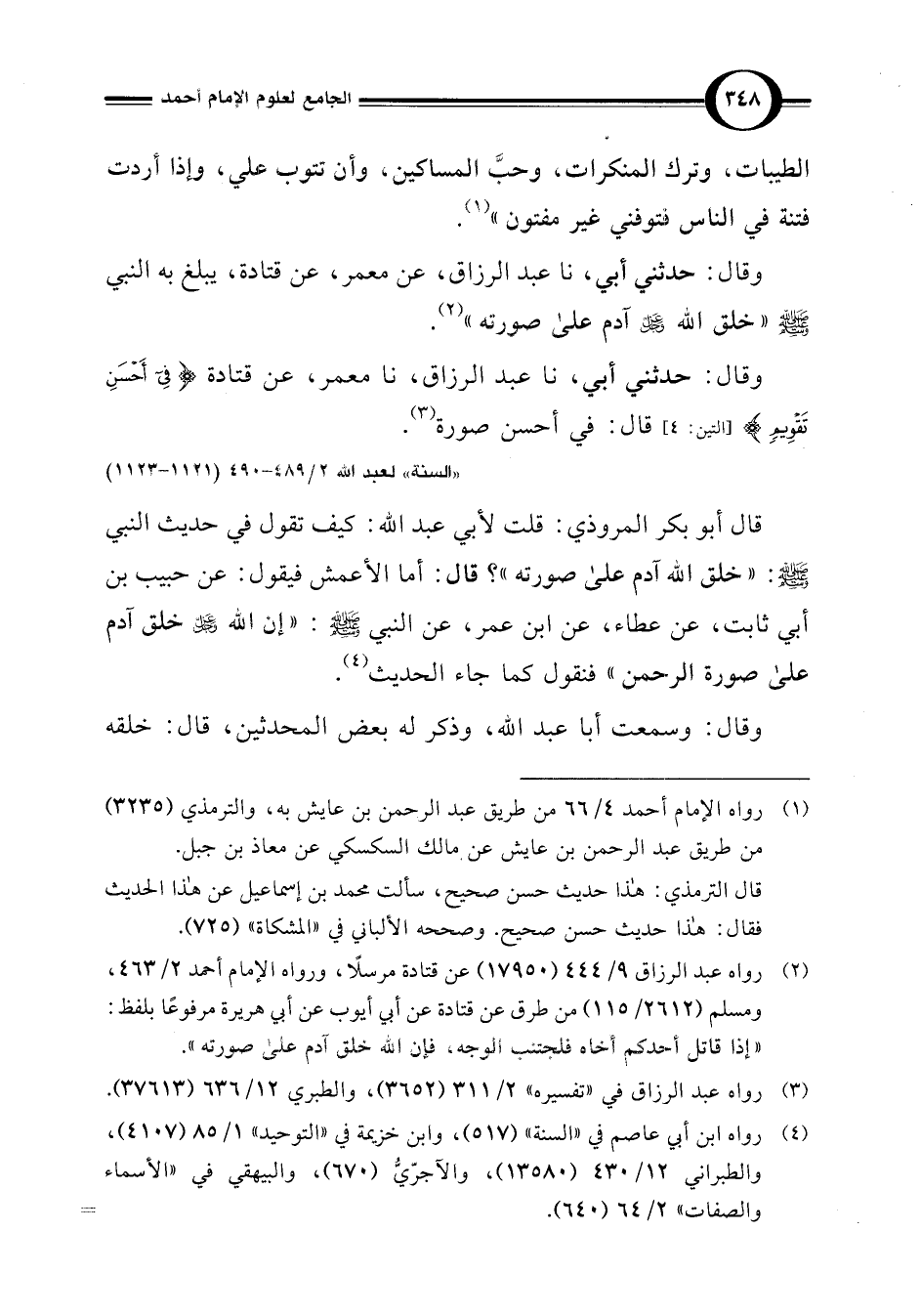 (¬2) رواه عبد الرزاق 9/ 444 (17950) عن قتادة مرسلًا، ورواه الإمام أحمد 2/ 463، ومسلم (2612/ 115) من طرق عن قتادة عن أبي أيوب عن أبي هريرة مرفوعًا بلفظ: "إذا قاتل أحدكم أخاه فلتجتنب الوجه، فإن اللَّه آدم على صورته".