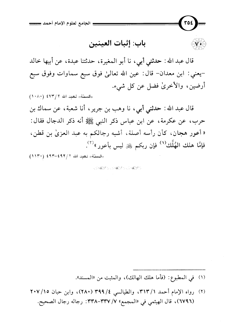 قال عبد اللَّه: حدثني أبي، نا وهب بن جرير، أنا شعبة، عن سماك بن حرب، عن عكرمة، عن ابن عباس ذكر النبي -صلى اللَّه عليه وسلم- أنه ذكر الدجال فقال: "أعور هجان، كأن رأسه أصلة، أشبه رجالكم به عبد العزة بن قطن، فإمَّا هلك الهلك (¬1) فإن ربكم ليس بأعور" (¬2).
