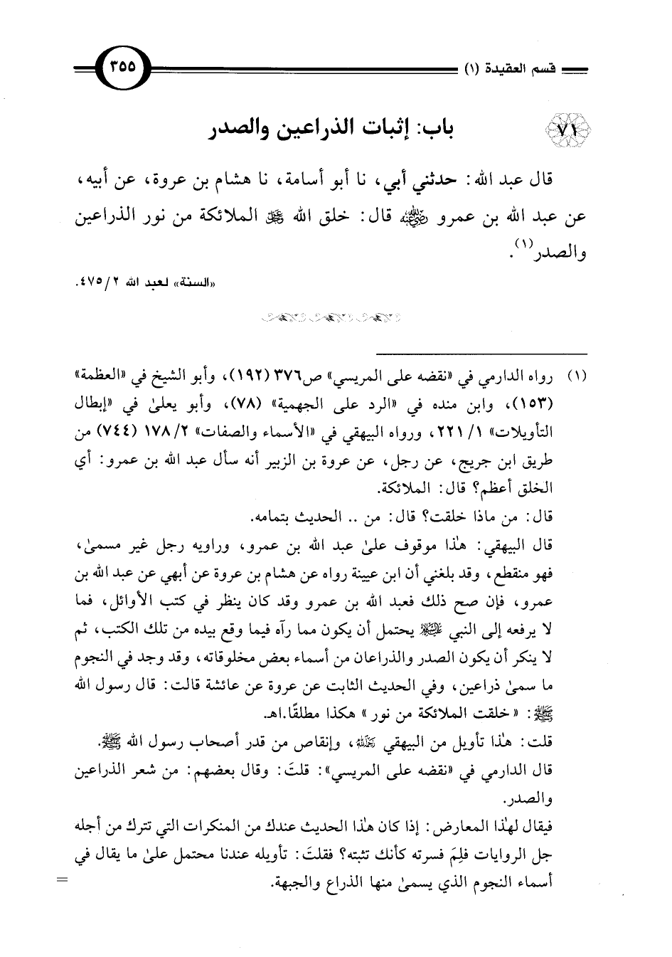 (¬1) رواه الدارمي في "نقضه على المريسي" ص 376 (192)، وأبو الشيخ في "العظمة" (153)، وابن منده في "الرد على الجهمية" (78)، وأبو يعلى في "إبطال التأويلات" 1/ 221، ورواه البيهقي في "الأسماء والصفات" 2/ 178 (744) من طريق ابن جريج، عن رجل، عن عروة بن الزبير أنه سأل عبد اللَّه بن عمرو: أي الخلق أعظم؟ قال: الملائكة.